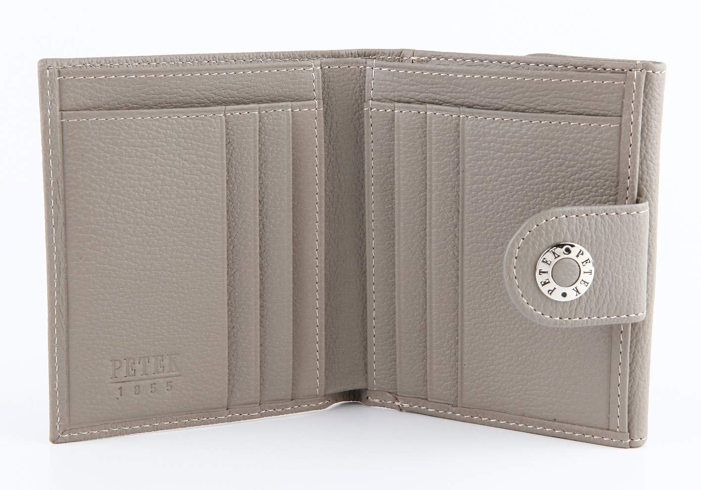 Женское элегантное портмоне Petek из натуральной кожи серого цвета с зернистой фактурой. Одно отделение для купюр, шесть отделений для кредитных карт, снаружи монетница на кнопке.