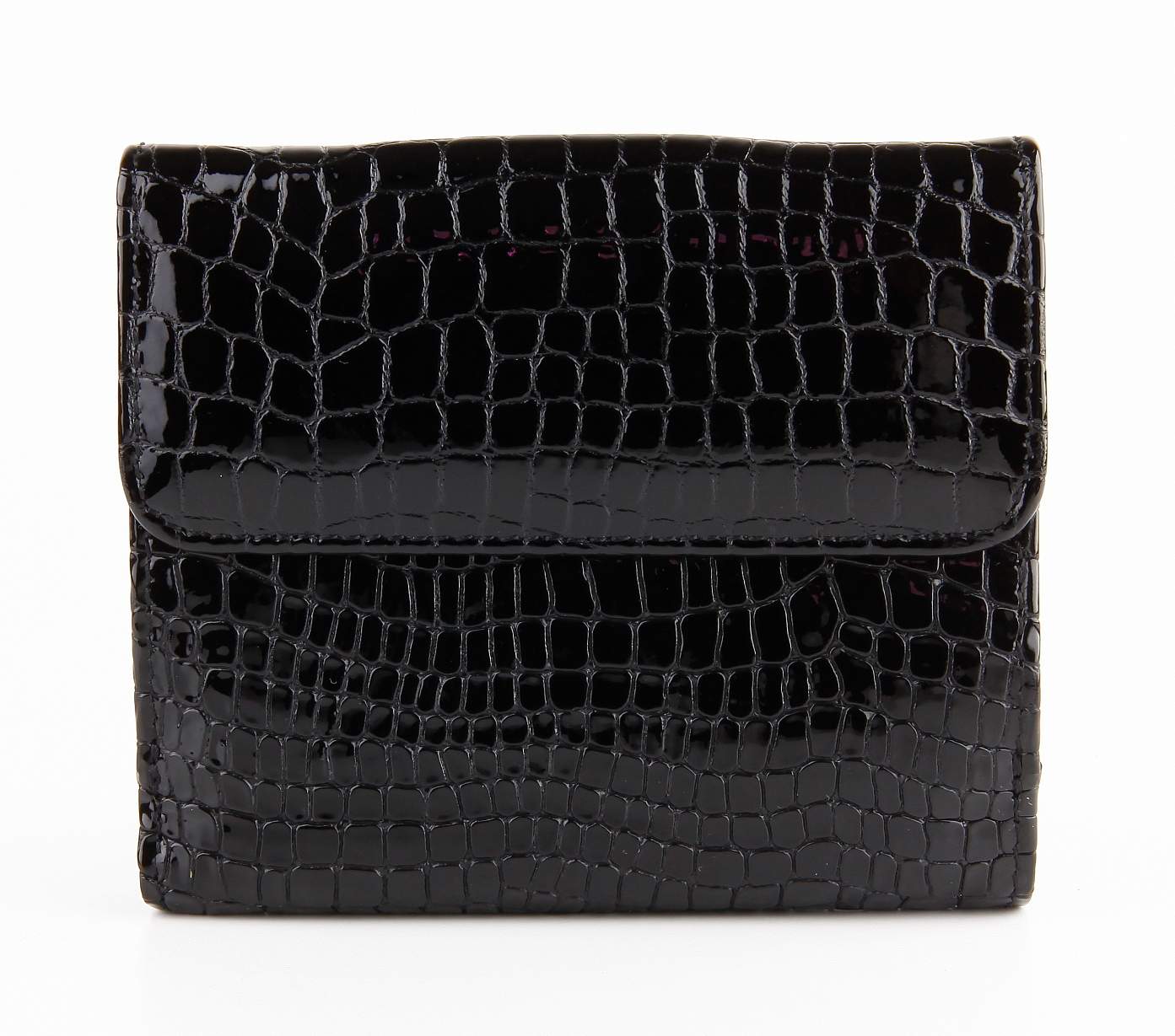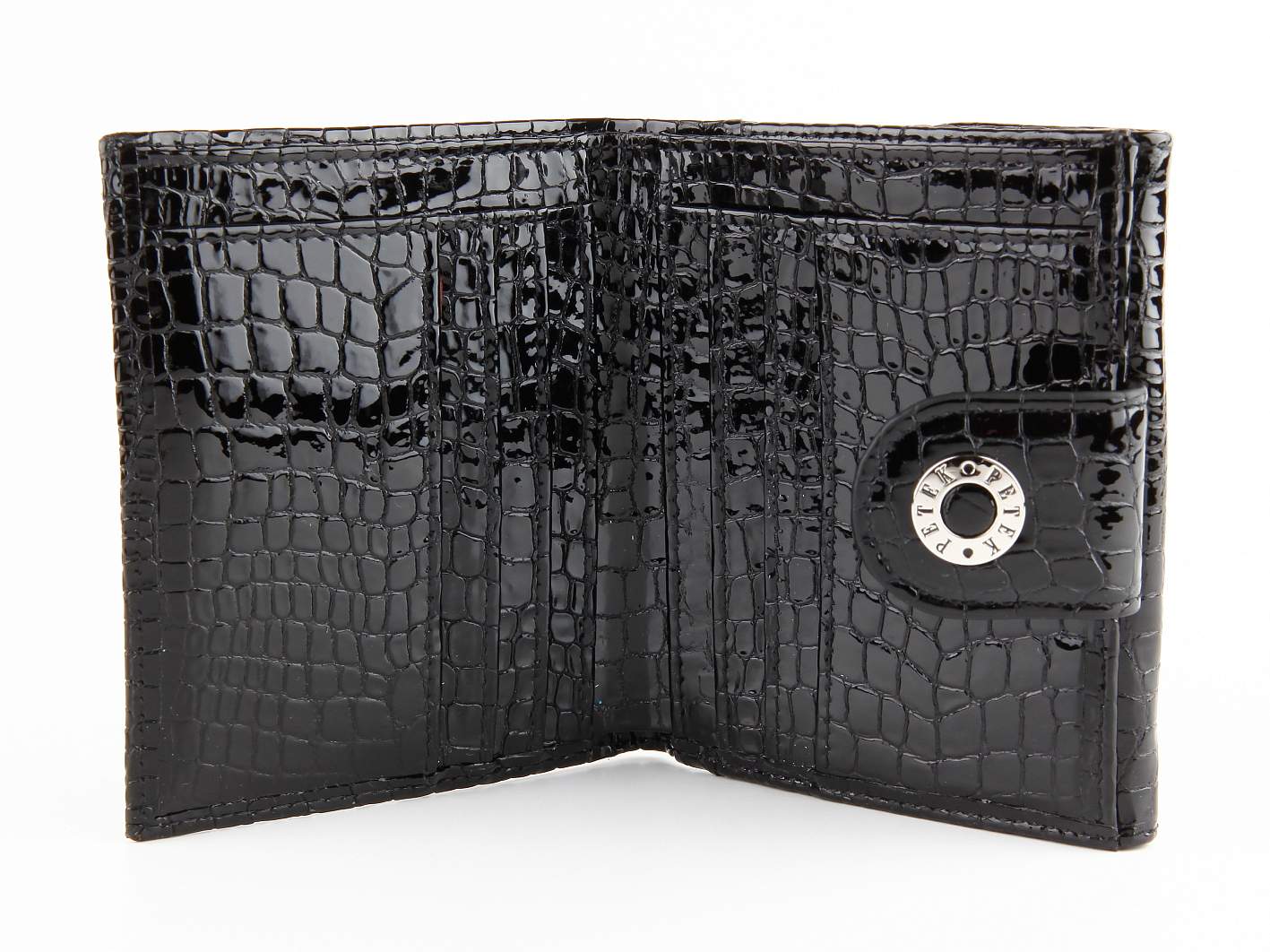 Женское элегантное портмоне Petek из натуральной кожи черного цвета с фактурой под питона. Одно отделение для купюр, шесть отделений для кредитных карт, снаружи монетница на кнопке.