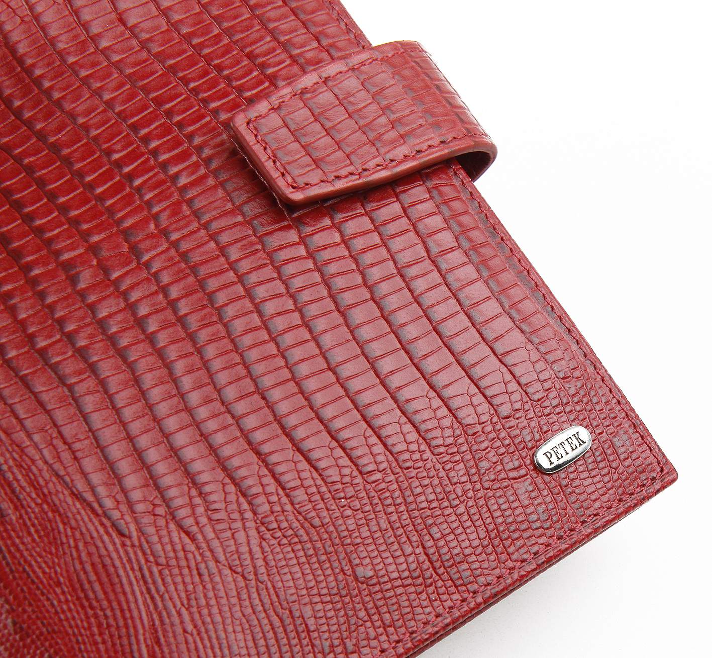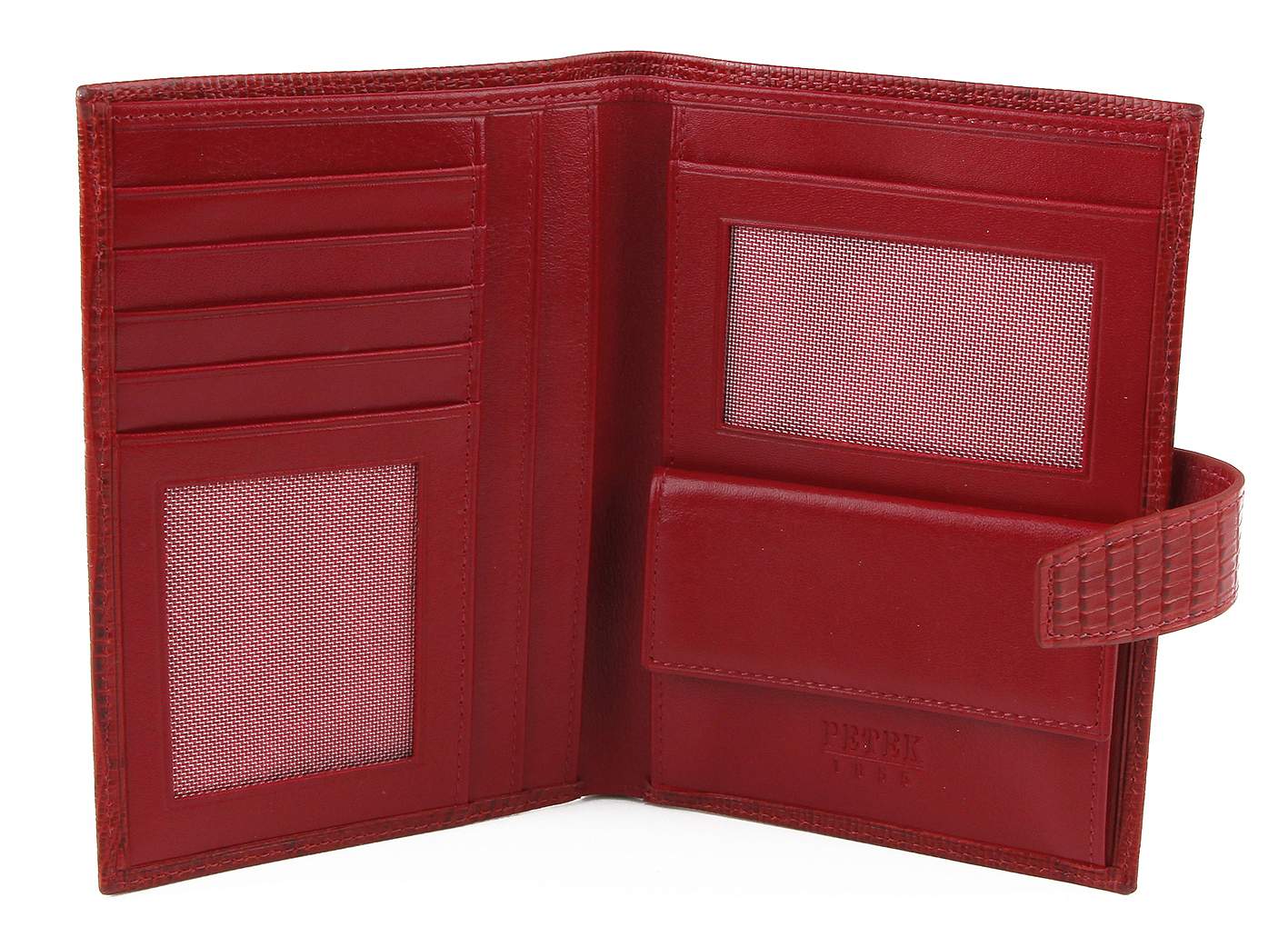 Мужское портмоне Petek из натуральной кожи красного цвета.Внутри: два отделения для купюр, монетница, прозрачное окошко, четыре боковых кармана и пять отделений для визитных или пластиковых карт.
