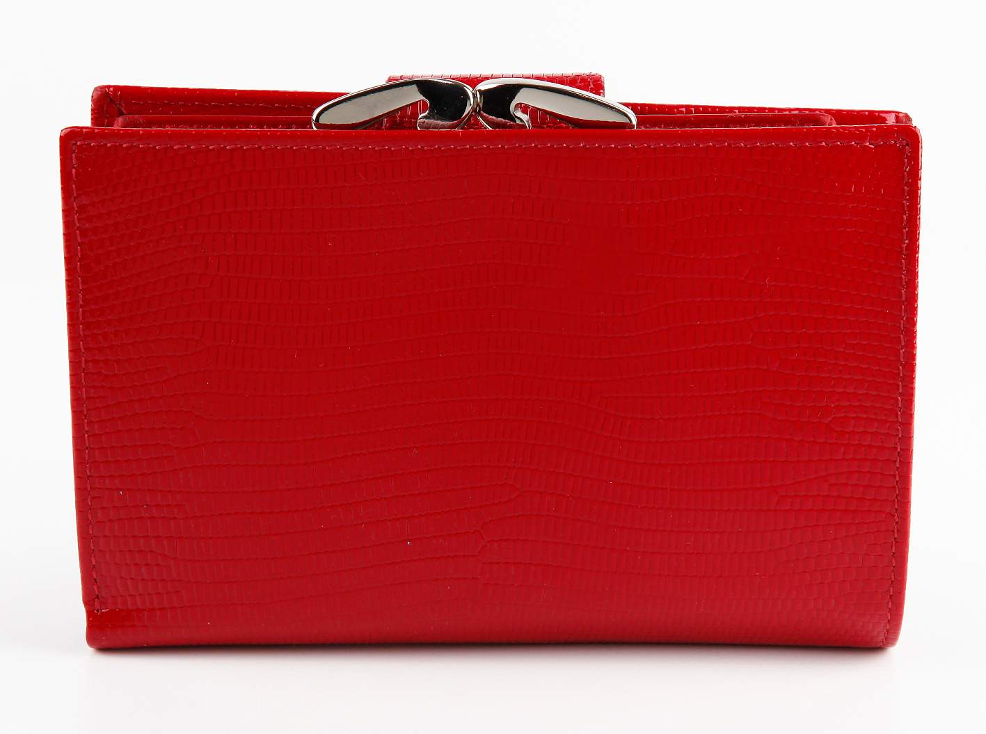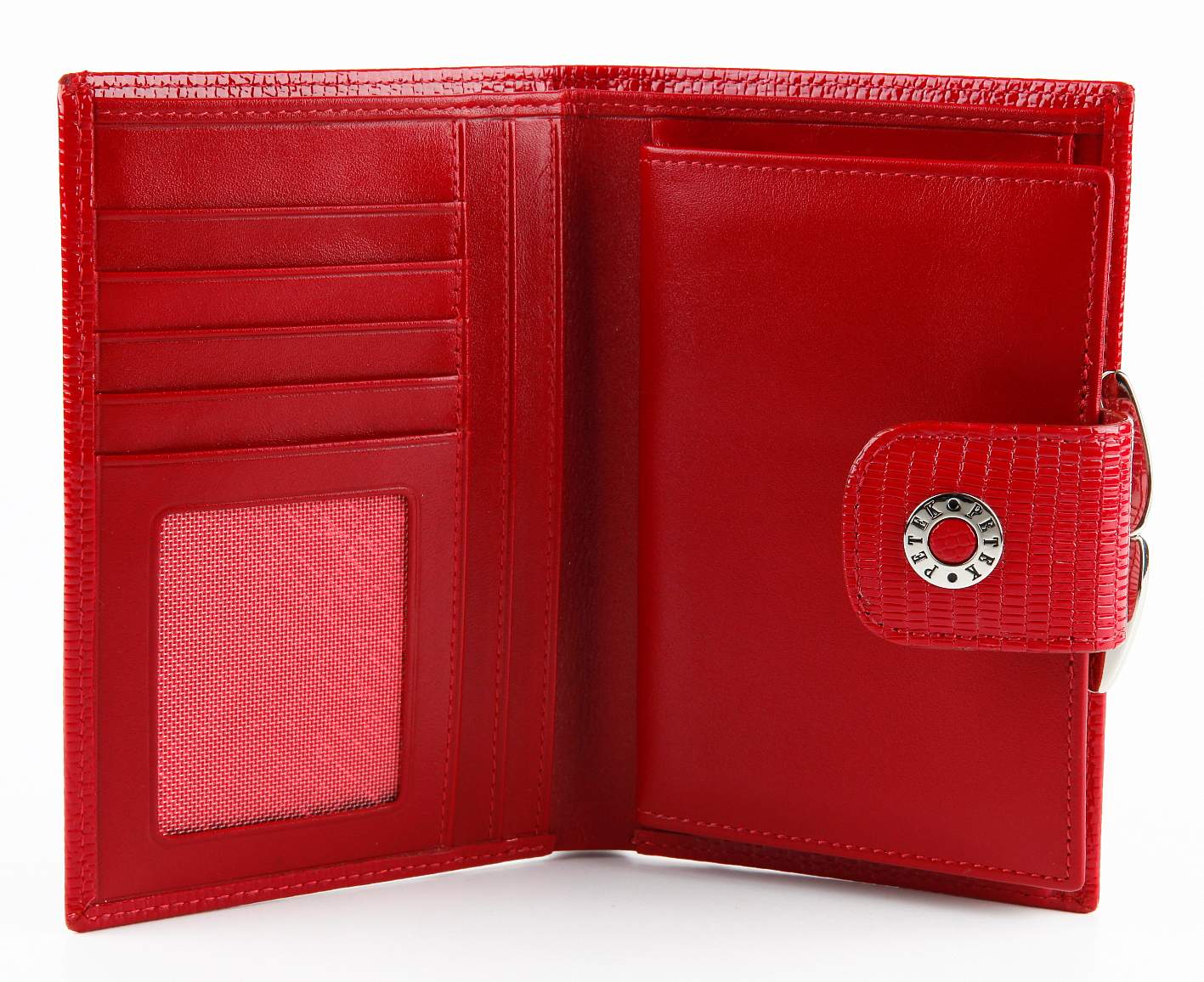 Женский элегантный кошелек Petek из натуральной кожи красного цвета с лакированной фактурой. Внутри: 1 отделение для купюр, 2 кармана, 5 карманов для кредитных карт, 2 отделения-сеточки, отделение для мелочи с металлической фурнитурой.
