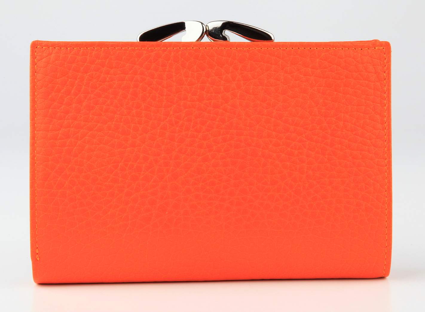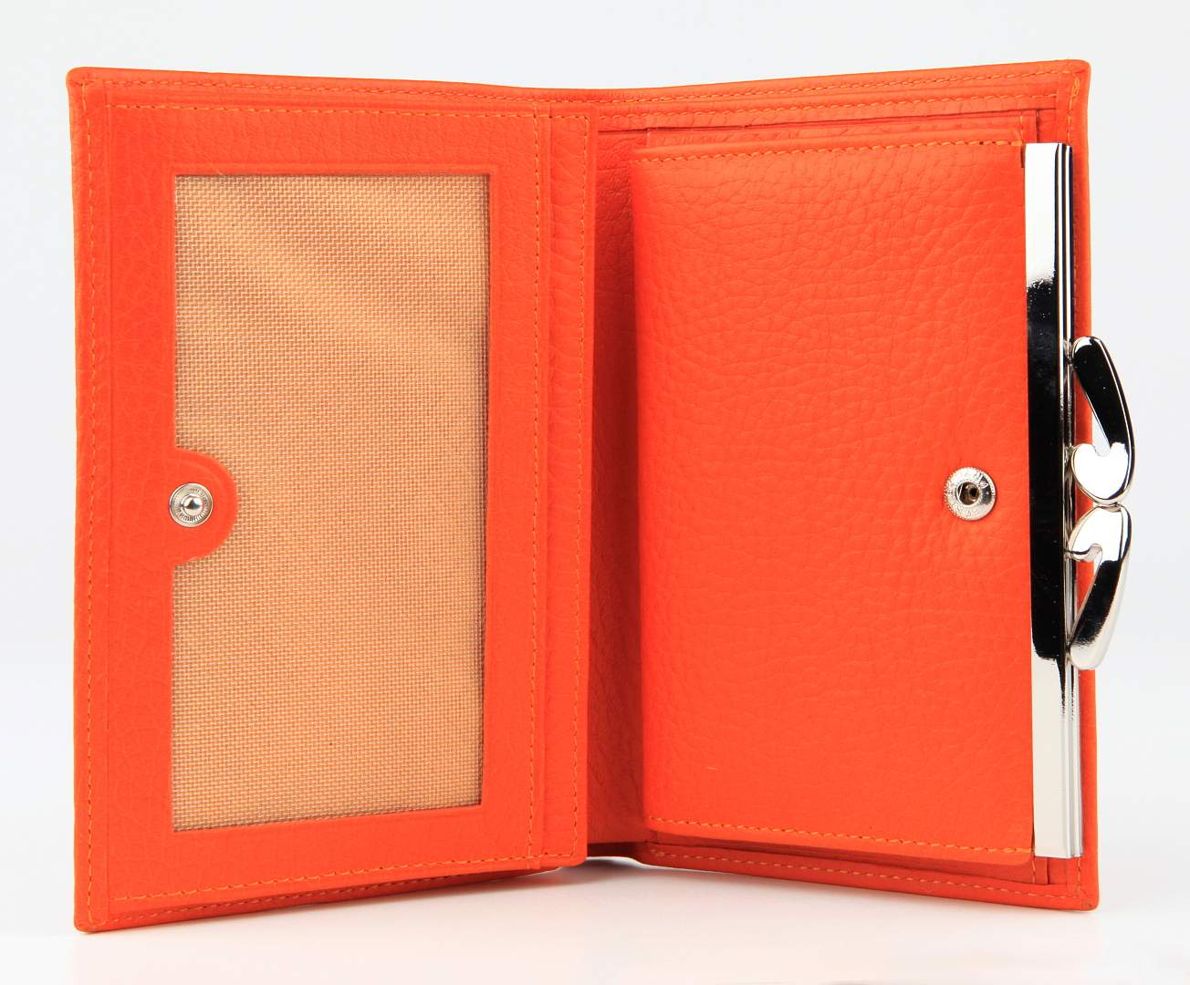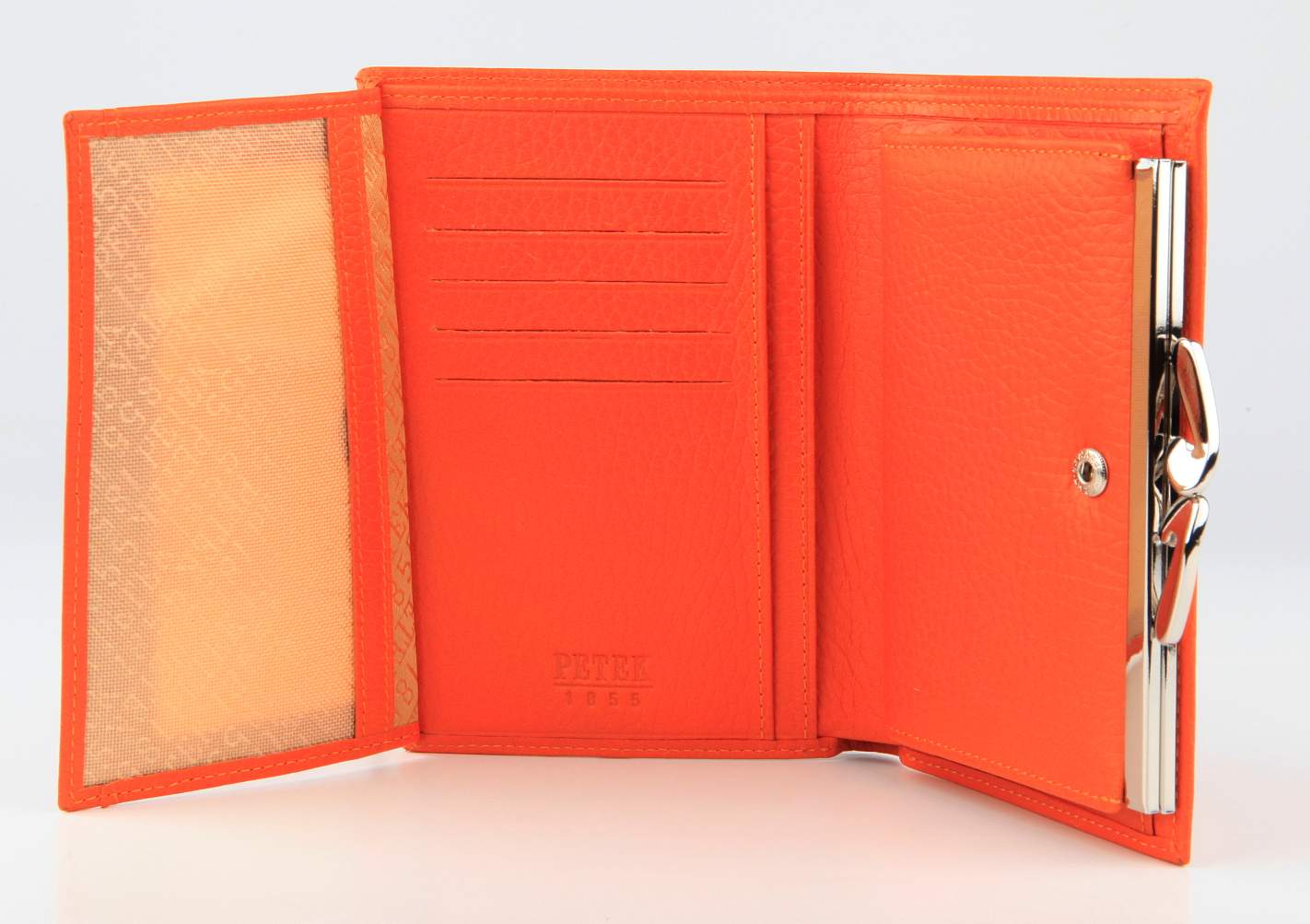 Женский элегантный кошелек Petek из натуральной кожи оранжевого цвета с зернистой фактурой. Внутри: 1 отделение для купюр, 2 кармана, 5 карманов для кредитных карт, 2 отделения-сеточки, отделение для мелочи с металлической фурнитурой.