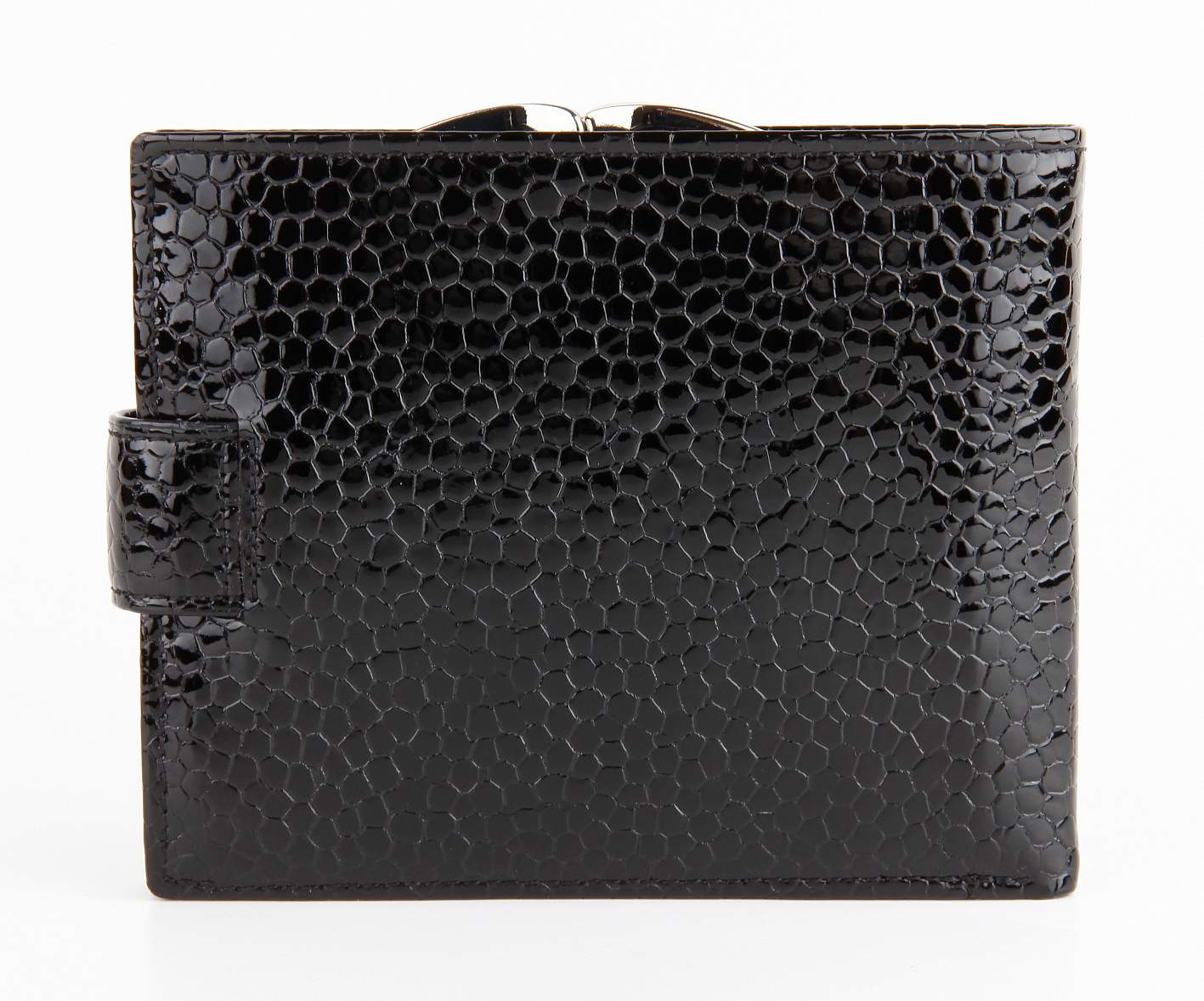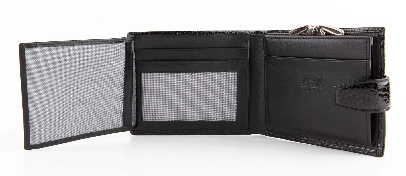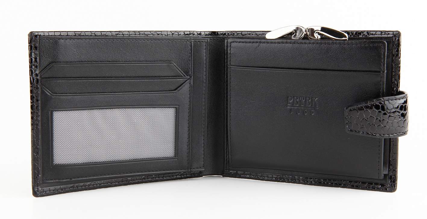 Женский элегантный кошелек Petek из натуральной черного цвета с фактурой под питона. Одно отделение для купюр, пять карманов для кредиток, окошко-сеточка (10х8.5 см), три кармашка, отделение для мелочи внутри.