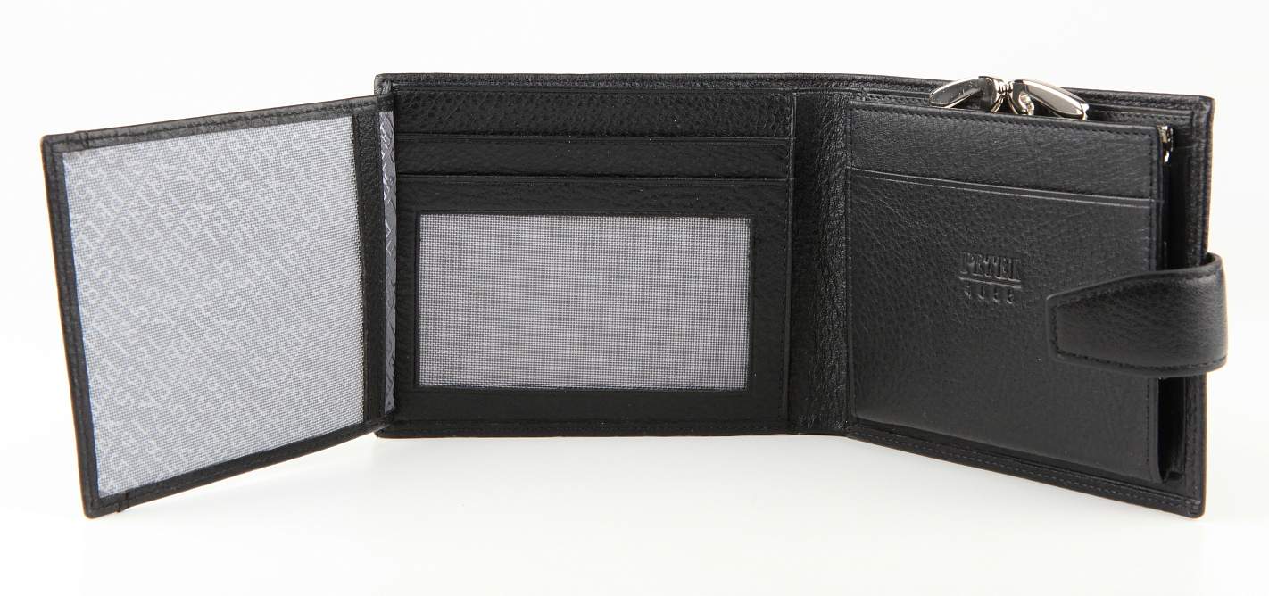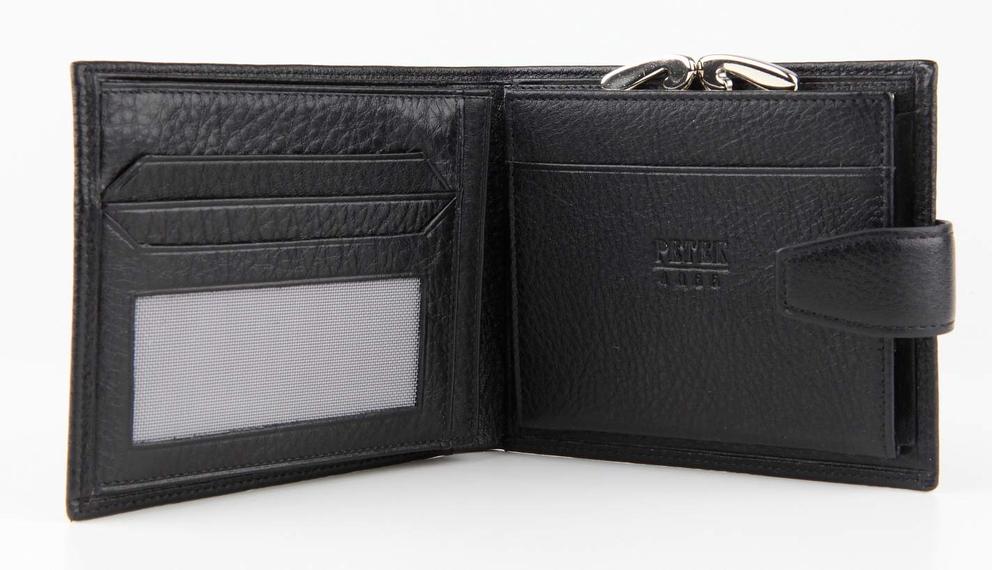Женский элегантный кошелек Petek из натуральной черного цвета с зернистой фактурой. Одно отделение для купюр, пять карманов для кредиток, окошко-сеточка (10х8.5 см), три кармашка, отделение для мелочи внутри.