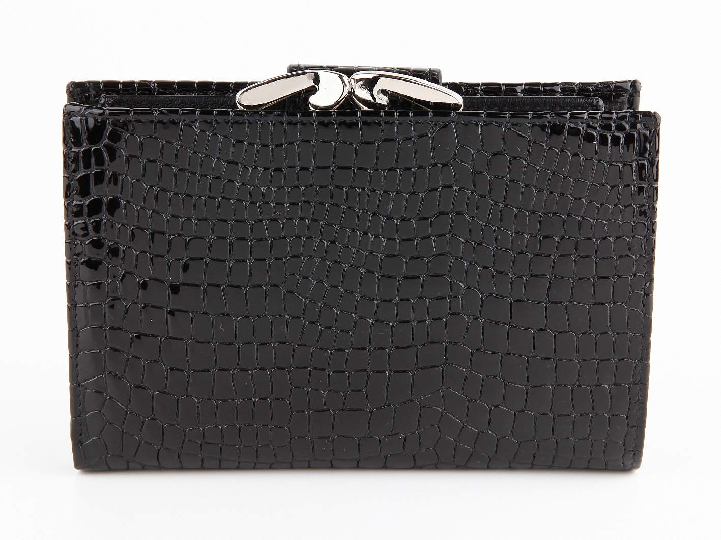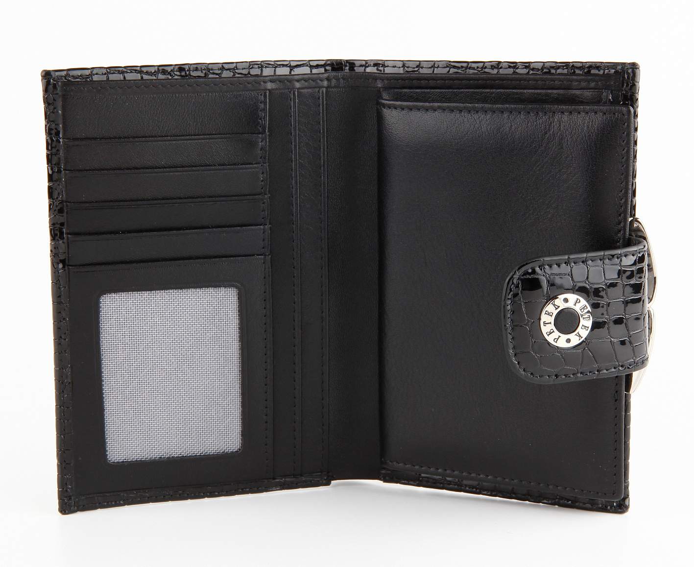 Женский кожаный кошелек Petek черного цвета. Эта модель обладает фактурой под питона. Внутри есть отделение для купюр, 5 отделений для кредитных карт, 1 прозрачное отделения для визиток/кредитных карт с отделением для монет Закрывается на кнопку.