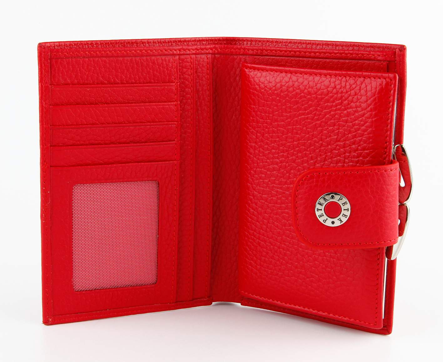Женский кожаный кошелек Petek красного цвета. Эта модель обладает зернистой фактурой. Внутри есть отделение для купюр, 5 отделений для кредитных карт, 1 прозрачное отделения для визиток/кредитных карт с отделением для монет Закрывается на кнопку.