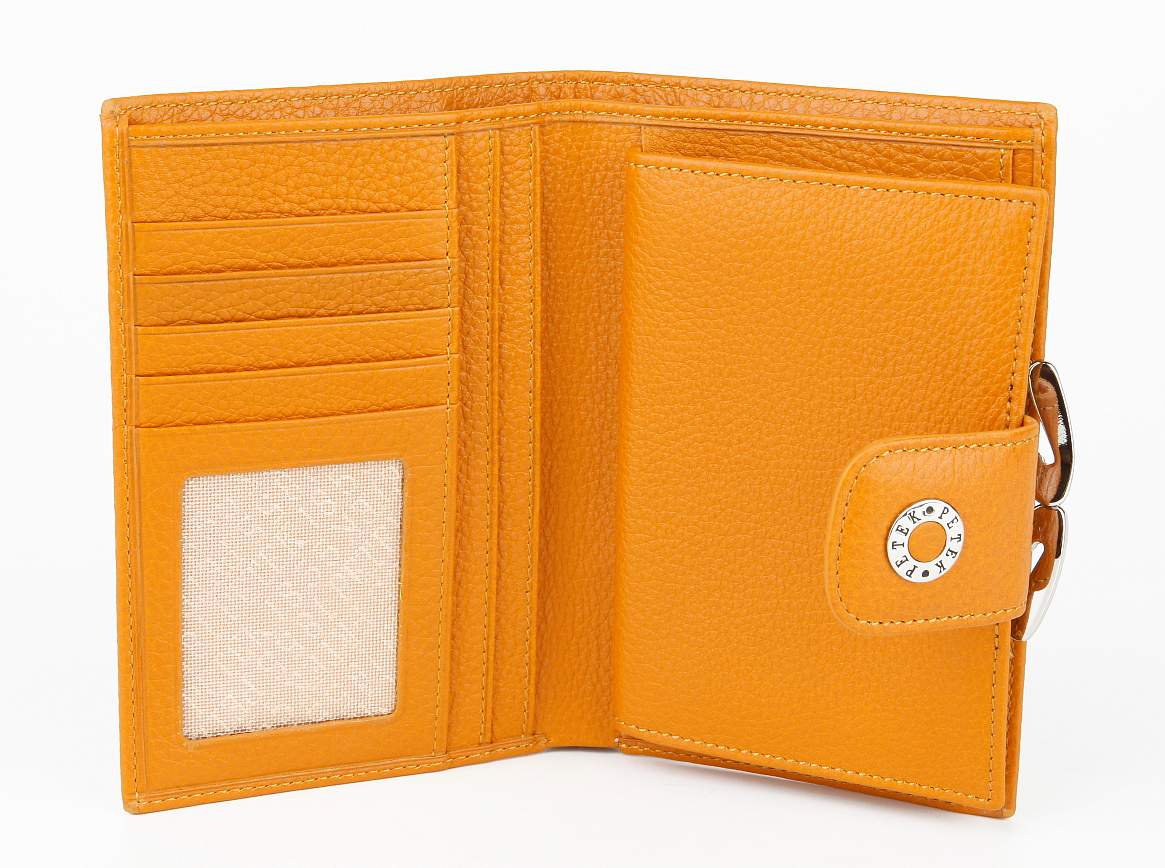 Женский классический элегантный кошелек Petek.Эта модель обладает гладкой фактурой. Внутри есть отделение для купюр, 5 отделения для кредитных карт, 1 прозрачное отделения для визиток/кредитных карт с отделением для монет Закрывается на кнопку.