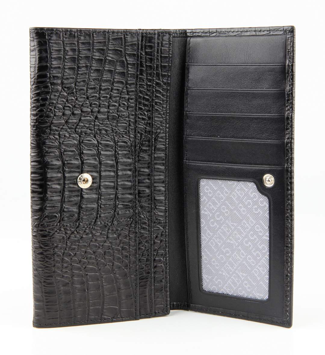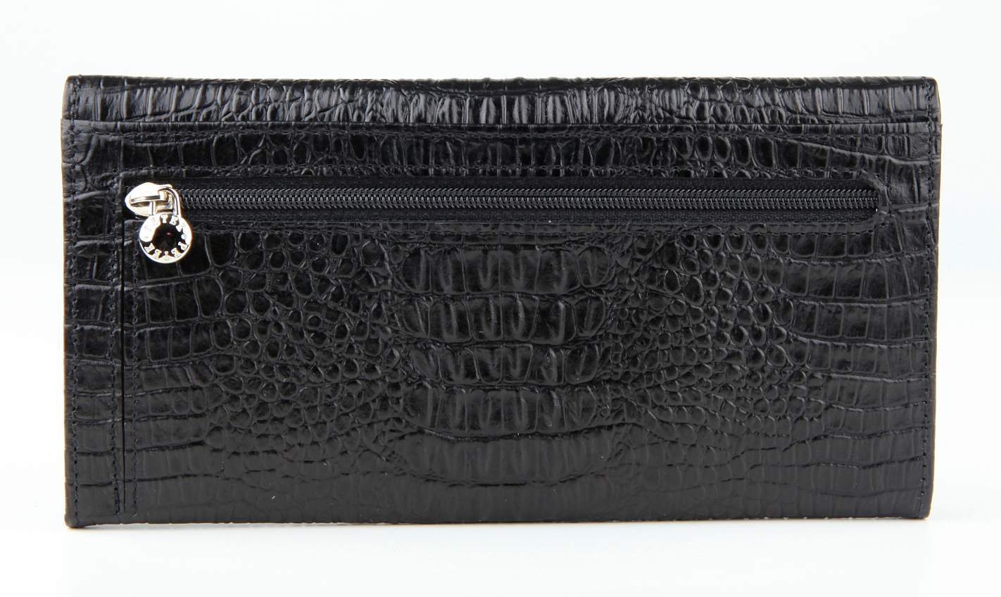 Женский элегантный классический кошелек Petek из натуральной кожи черного цвета с фактурой под крокодила. Внутри: 3 отделения для купюр, 5 отделений для кредитных карт, отделение для мелочи на молнии.