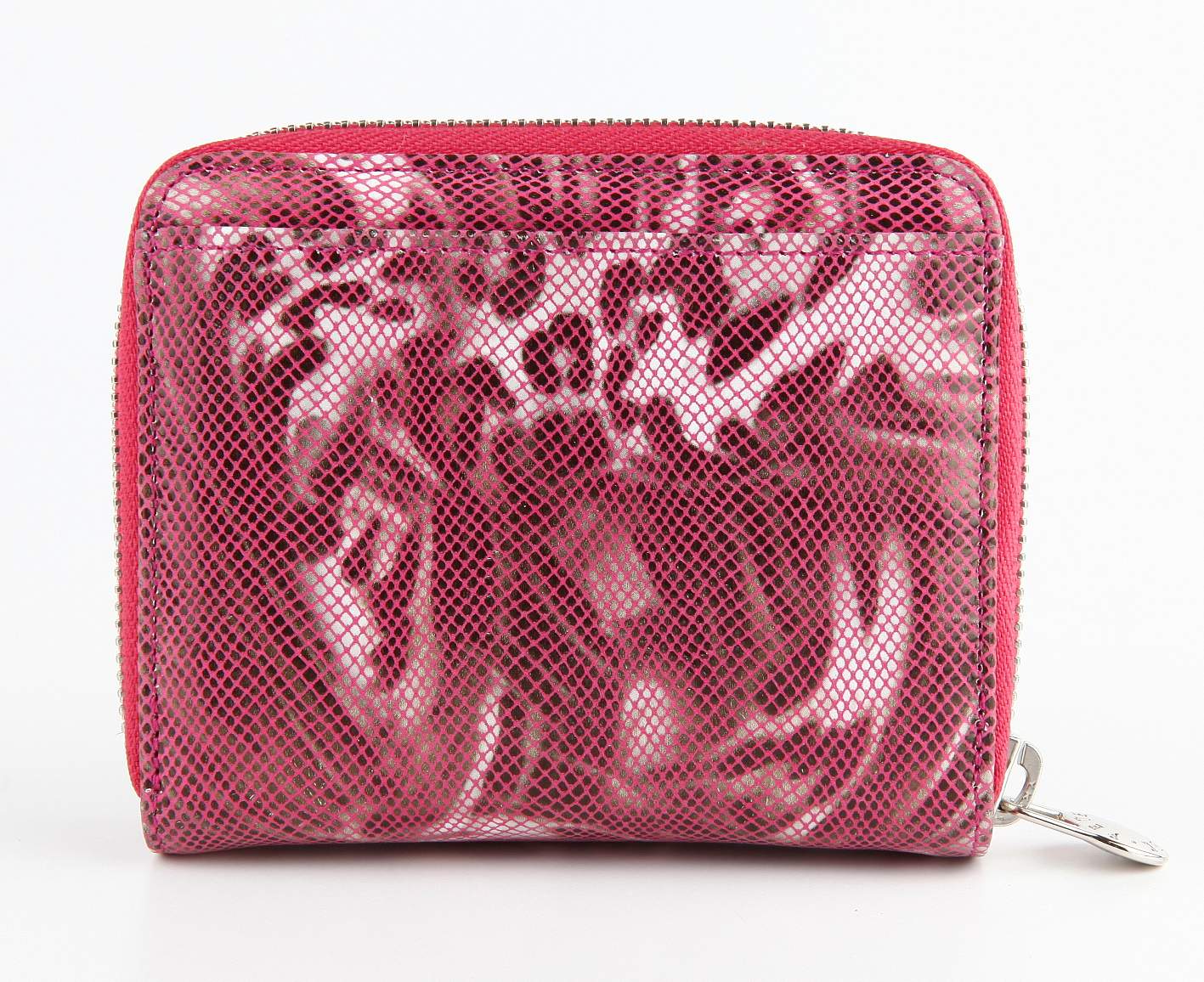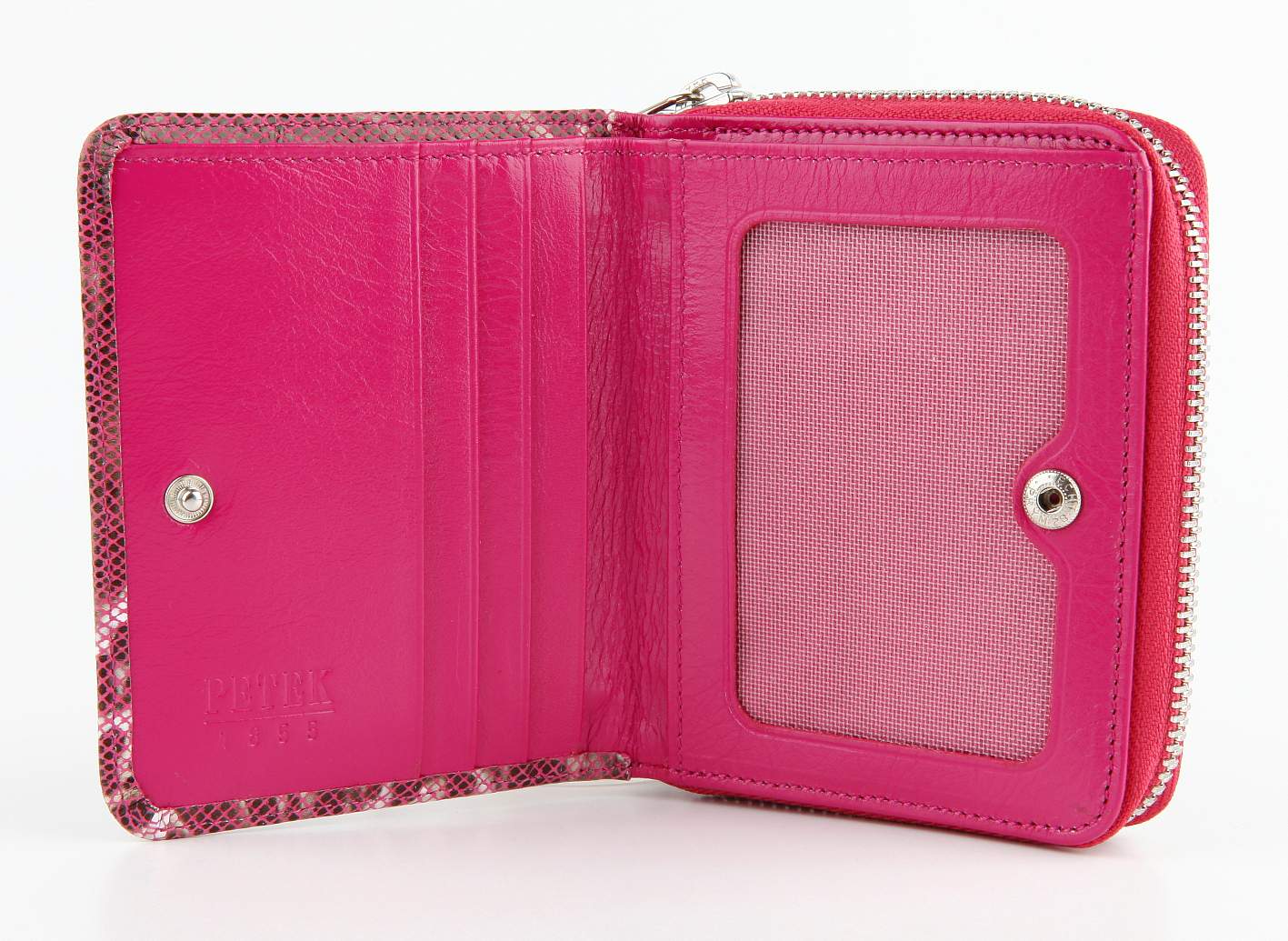 Женский элегантный кошелек Petek из натуральной кожи розового цвета с фактурой под питона. Отделение для купюр. Отделение для мелочи. 6 отделений для карточек. 1 дополнительное отделение. Закрывается на кнопку и на молнию.
