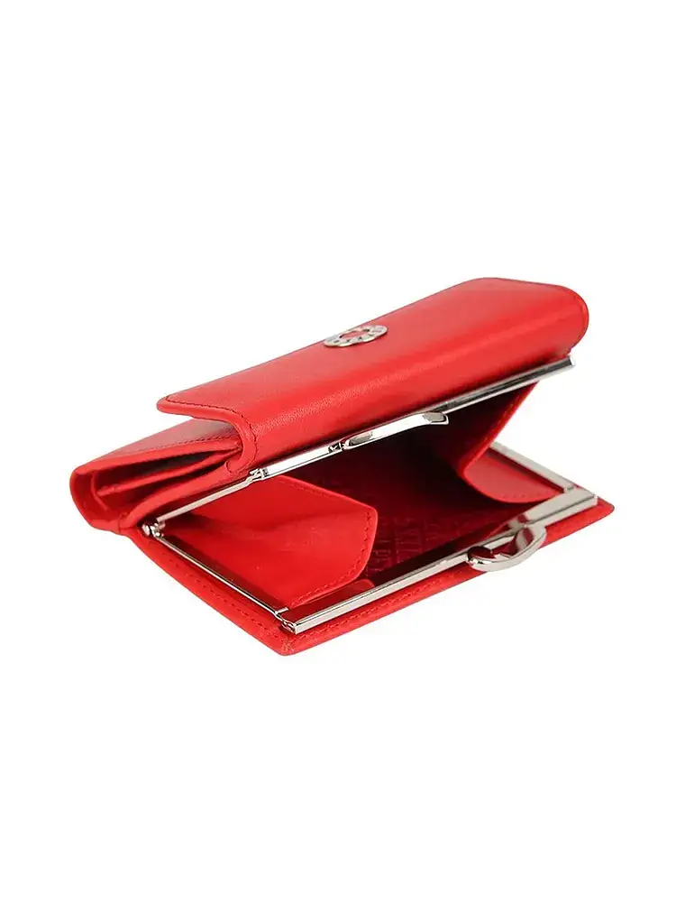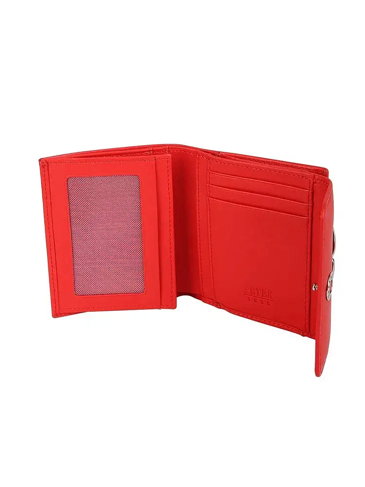 Элегантный кошелек из натуральной кожи Petek закрывается на кнопку. Внутри он разделен на два отсека. Первый отсек закрывается клапаном на застежку-кнопку и содержит одно отделение для купюр, четыре накладных кармана (два из которых имеют “окошко” из прозрачного пластика), шесть вертикальных кармашков для визиток и кредитных карт, а также два потайных кармана. Второй отсек закрывается на замок-фермуар и используется как кармашек для монет.