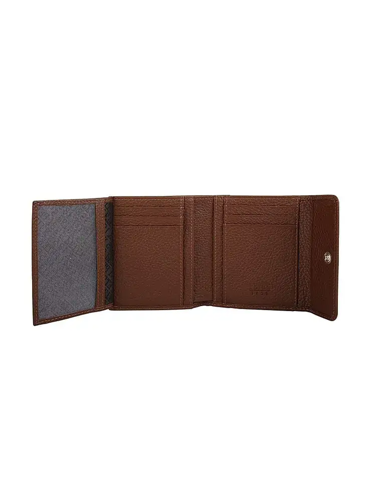 Элегантный кошелек из натуральной кожи Petek закрывается на кнопку. Внутри он разделен на два отсека. Первый отсек закрывается клапаном на застежку-кнопку и содержит одно отделение для купюр, четыре накладных кармана (два из которых имеют “окошко” из прозрачного пластика), шесть вертикальных кармашков для визиток и кредитных карт, а также два потайных кармана. Второй отсек закрывается на замок-фермуар и используется как кармашек для монет.