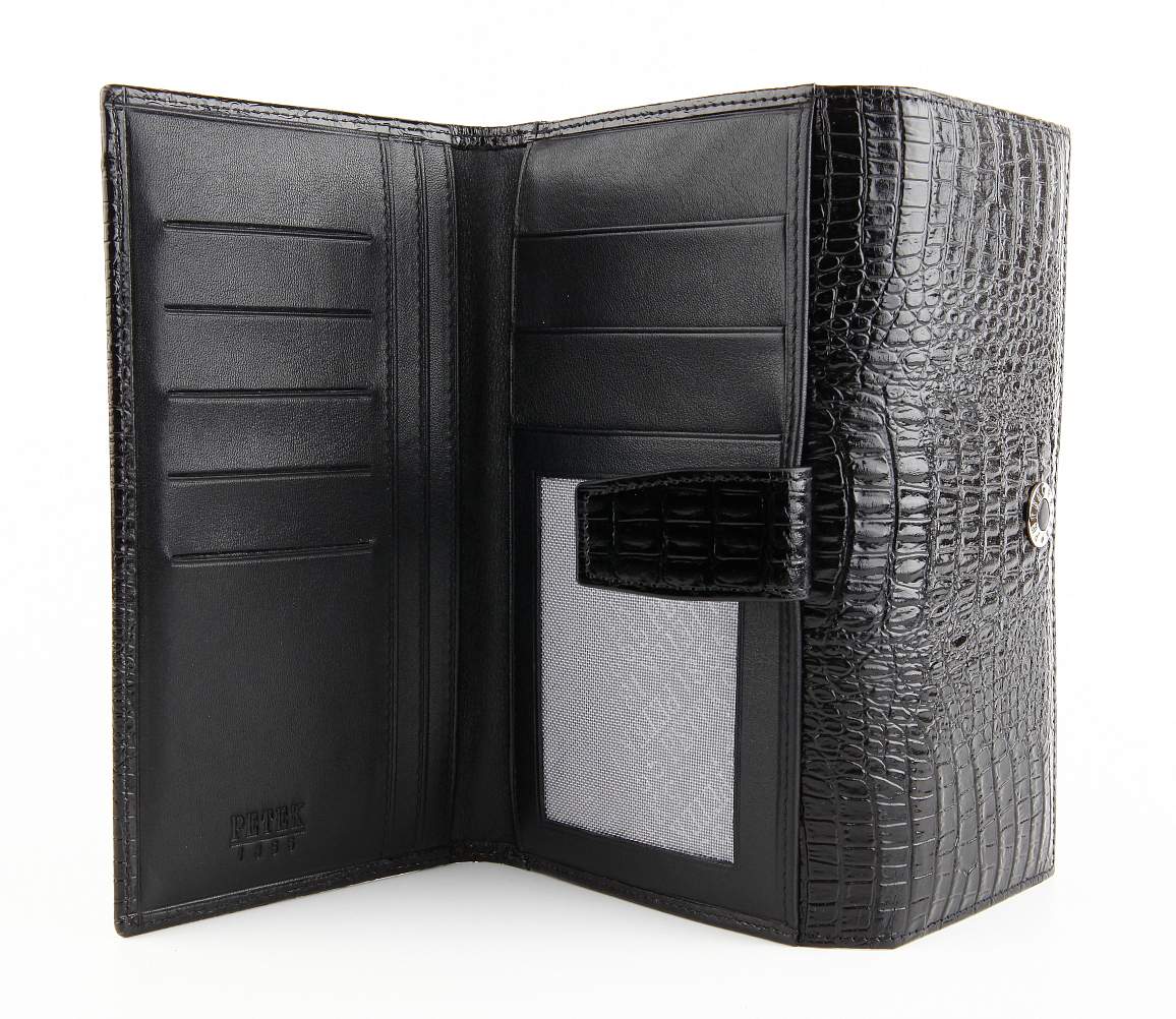 Кошелек: на задней стенке откидное отделение, в котором на левой стенке находится три отделения: пять отделений для пластиковых и визитных карт, на правой стенке - один отделение: три отделения для пластиковых карт.
