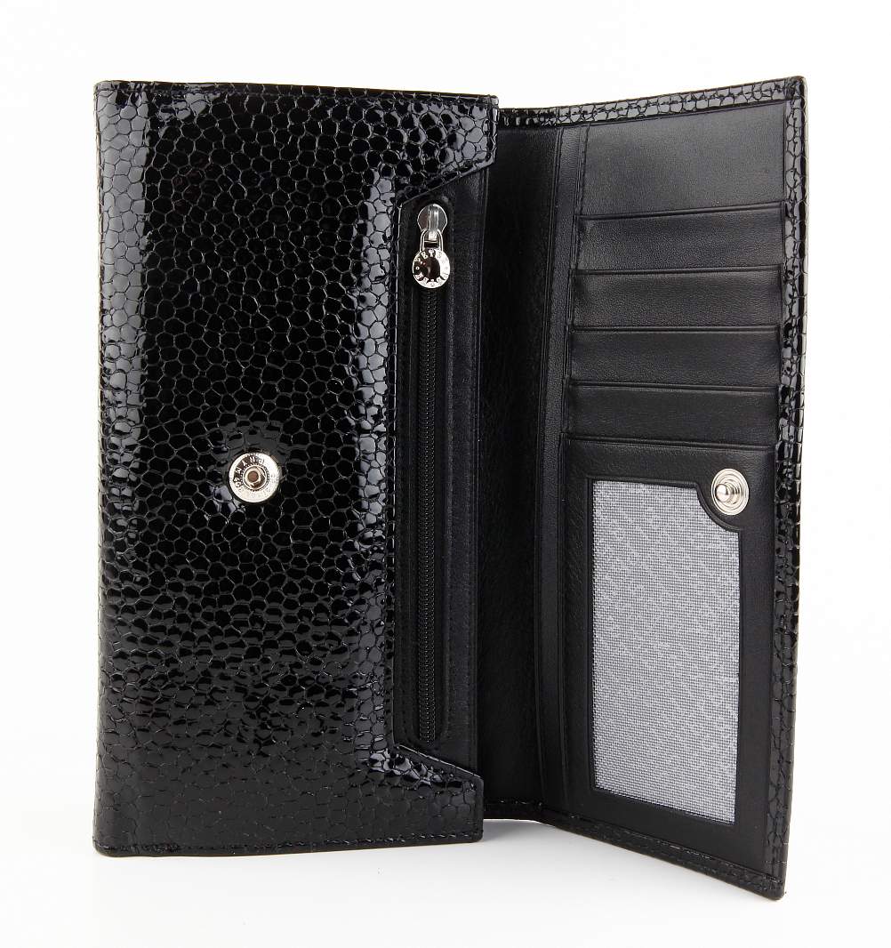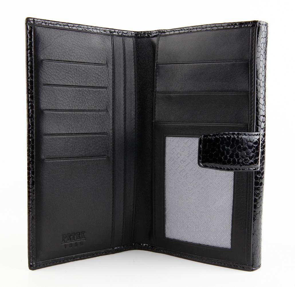 Кошелек: на задней стенке откидное отделение, в котором на левой стенке находится три отделения: пять отделений для пластиковых и визитных карт, на правой стенке - один отделение: три отделения для пластиковых карт.