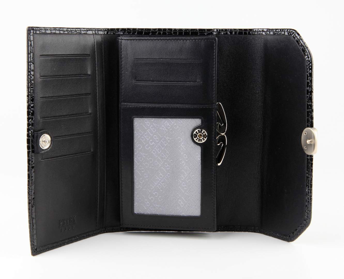 Кошелек. Закрывается на кнопку. Состоит из трех отделений для купюр, одного внутреннего кармана, отделения на защелке. На отстегивающейся средней вставке находится восемь отделений под визитные и кредитные карточки и два отделения под купюры.