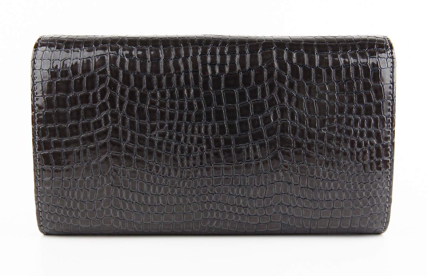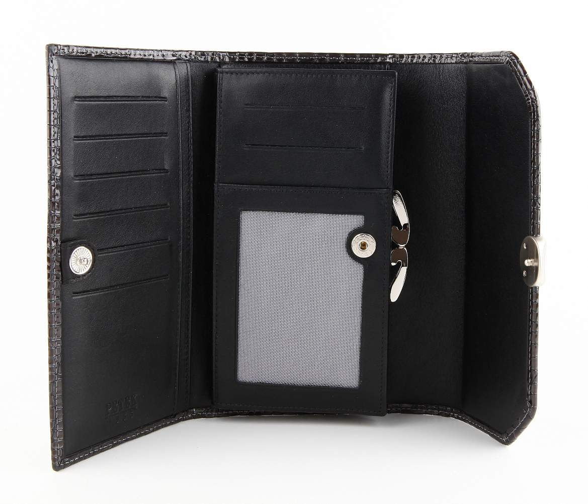 Кошелек. Закрывается на кнопку. Состоит из трех отделений для купюр, одного внутреннего кармана, отделения на защелке. На отстегивающейся средней вставке находится восемь отделений под визитные и кредитные карточки и два отделения под купюры.