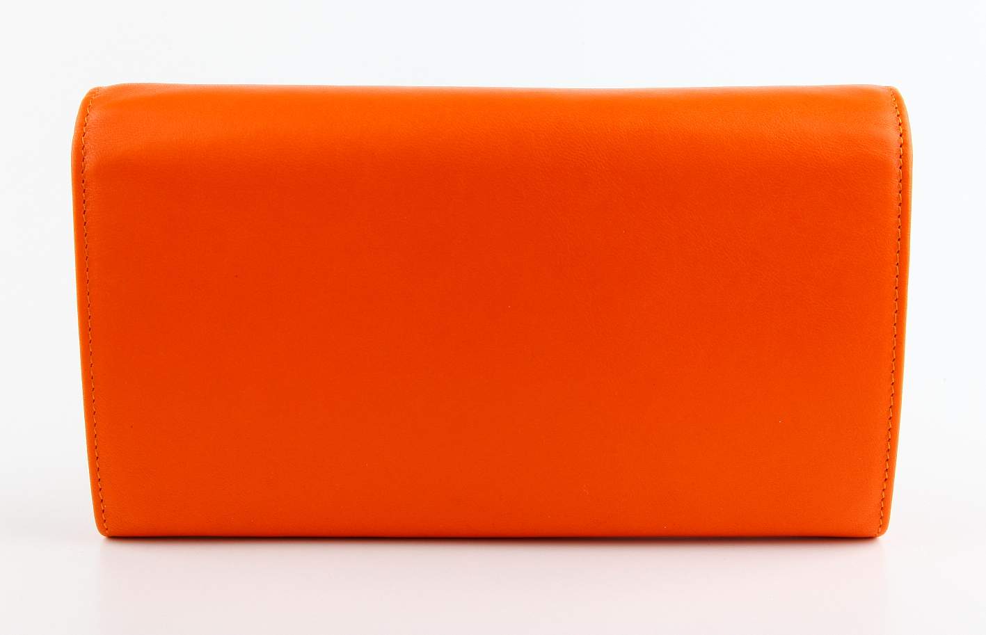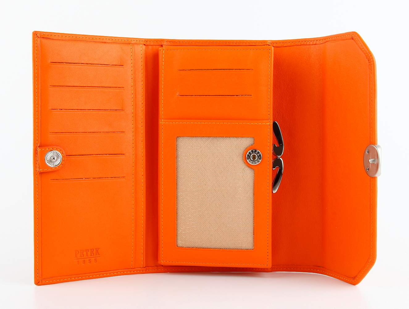 Кошелек. Закрывается на кнопку. Состоит из трех отделений для купюр, одного внутреннего кармана, отделения на защелке. На отстегивающейся средней вставке находится восемь отделений под визитные и кредитные карточки и два отделения под купюры.