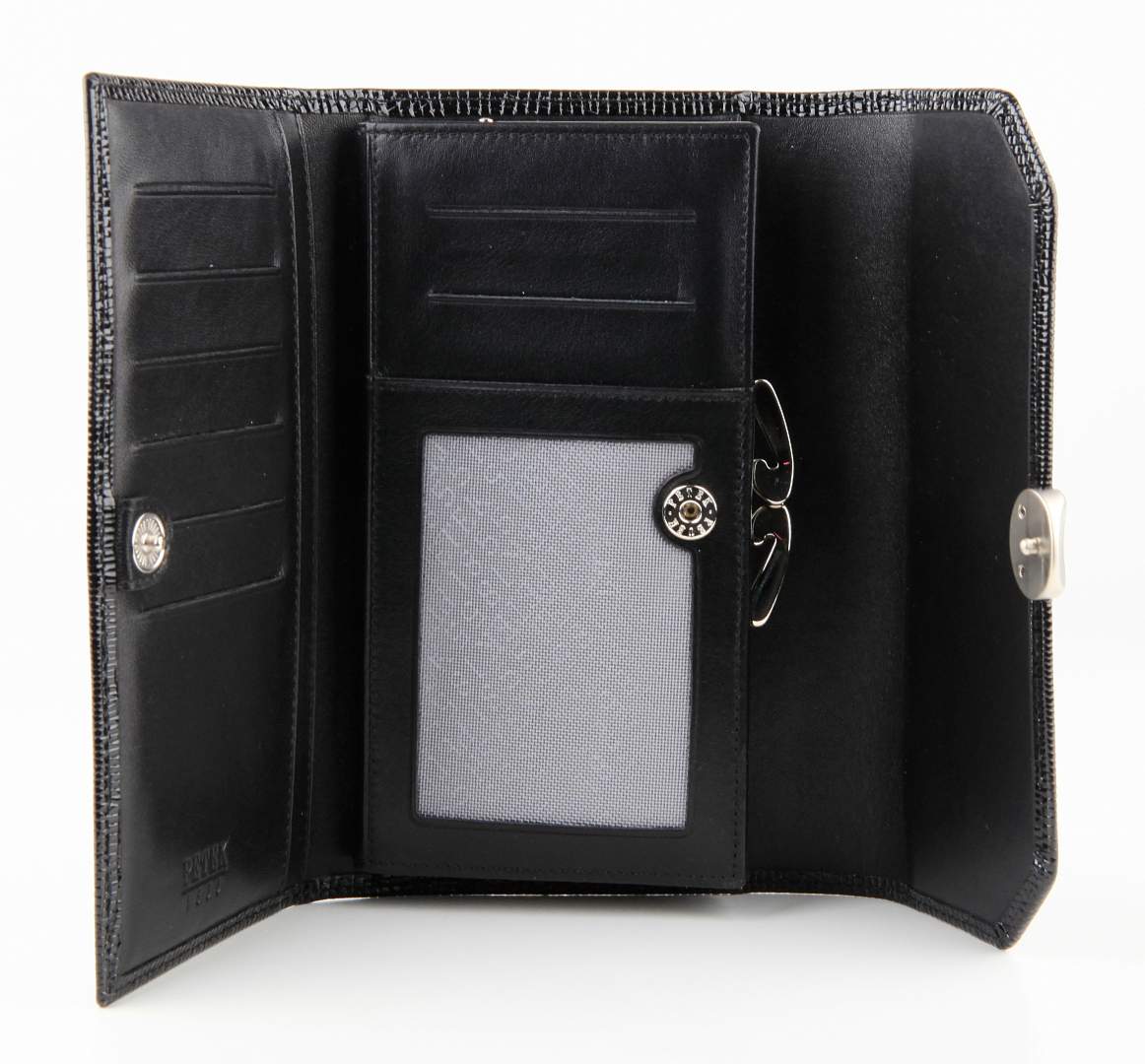 Кошелек. Закрывается на кнопку. Состоит из трех отделений для купюр, одного внутреннего кармана, отделения на защелке. На отстегивающейся средней вставке находится восемь отделений под визитные и кредитные карточки и два отделения под купюры.
