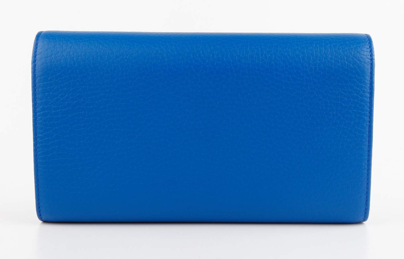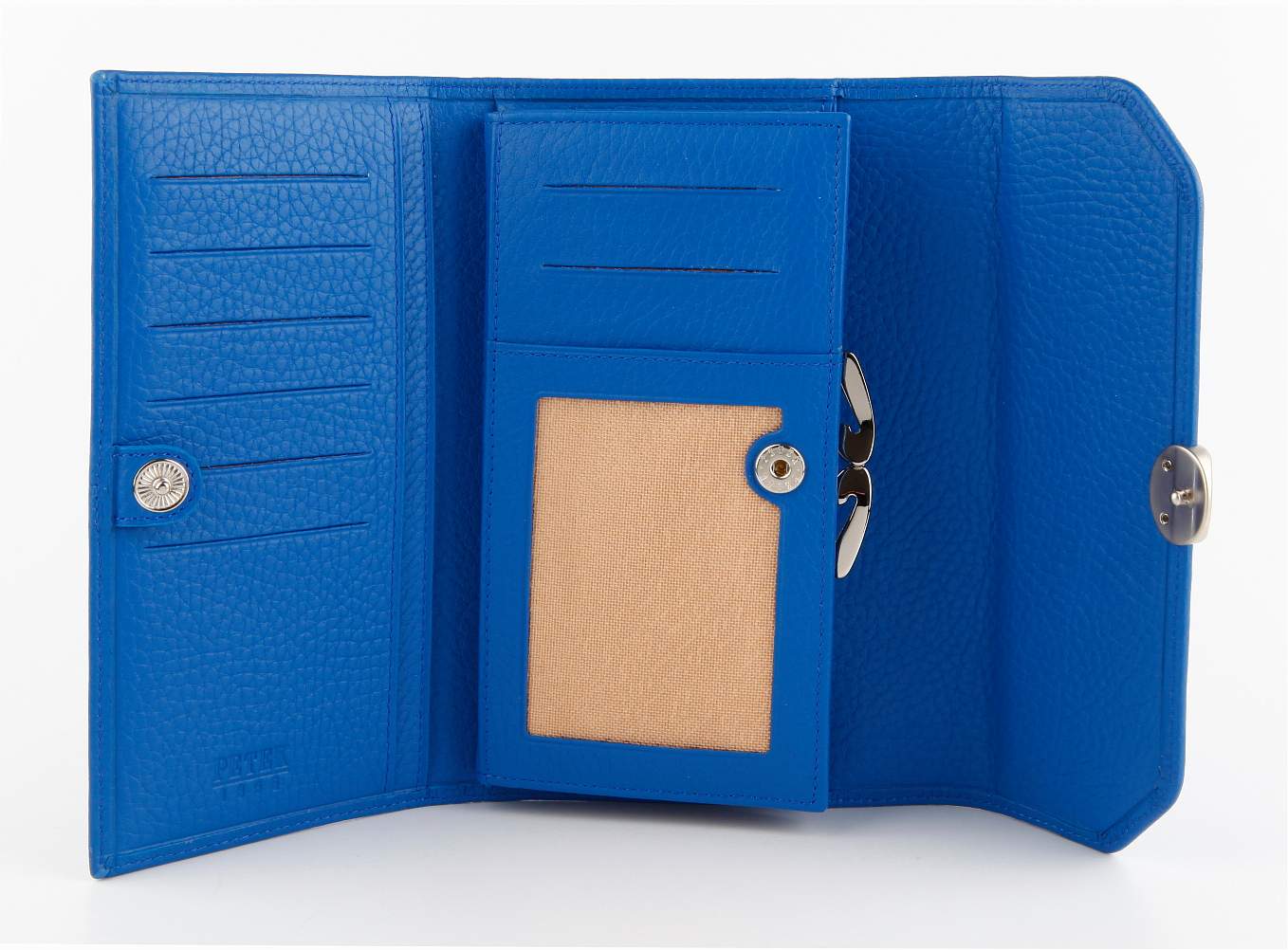 Кошелек. Закрывается на кнопку. Состоит из трех отделений для купюр, одного внутреннего кармана, отделения на защелке. На отстегивающейся средней вставке находится восемь отделений под визитные и кредитные карточки и два отделения под купюры.