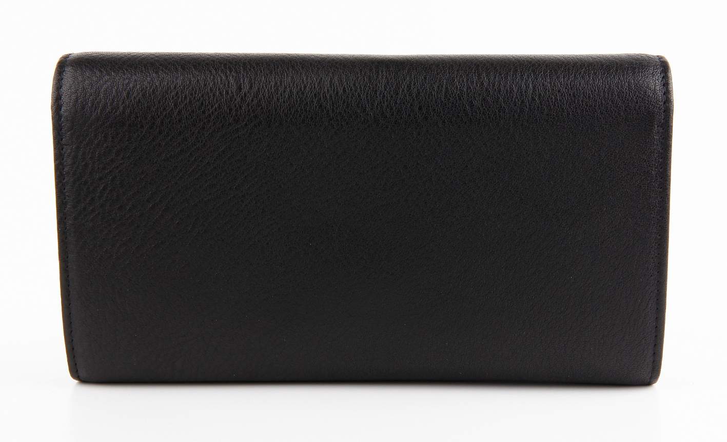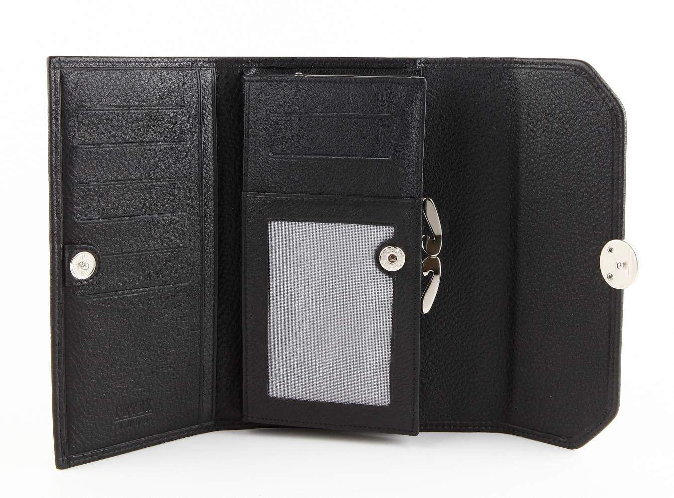 Кошелек. Закрывается на кнопку. Состоит из трех отделений для купюр, одного внутреннего кармана, отделения на защелке. На отстегивающейся средней вставке находится восемь отделений под визитные и кредитные карточки и два отделения под купюры.