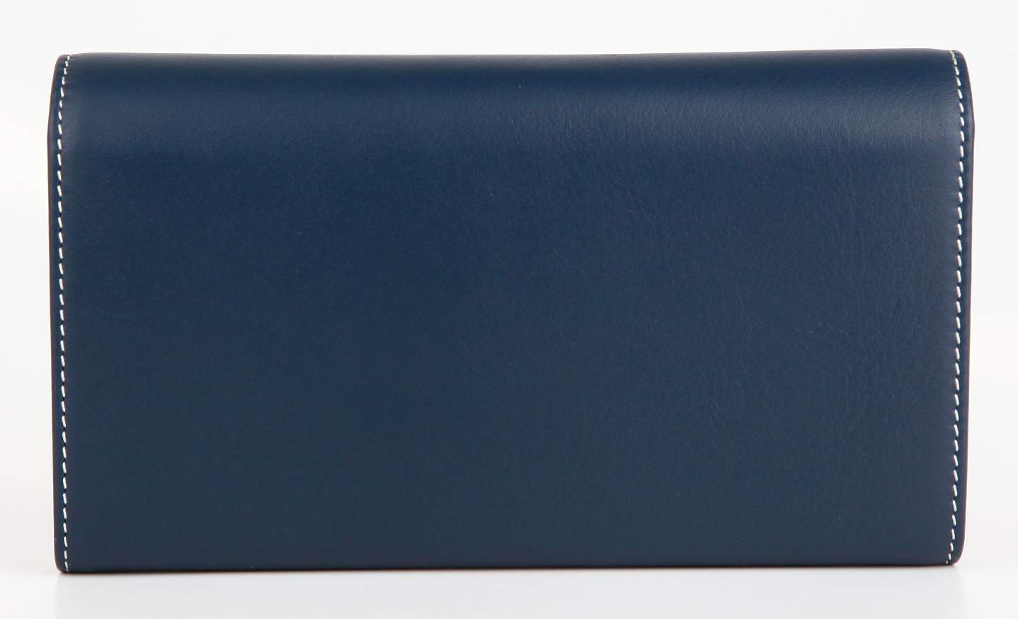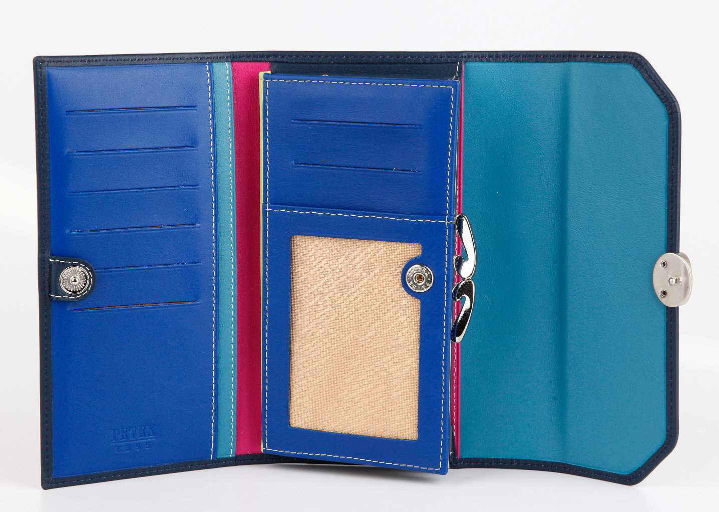 Кошелек. Закрывается на кнопку. Состоит из трех отделений для купюр, одного внутреннего кармана, отделения на защелке. На отстегивающейся средней вставке находится восемь отделений под визитные и кредитные карточки и два отделения под купюры.