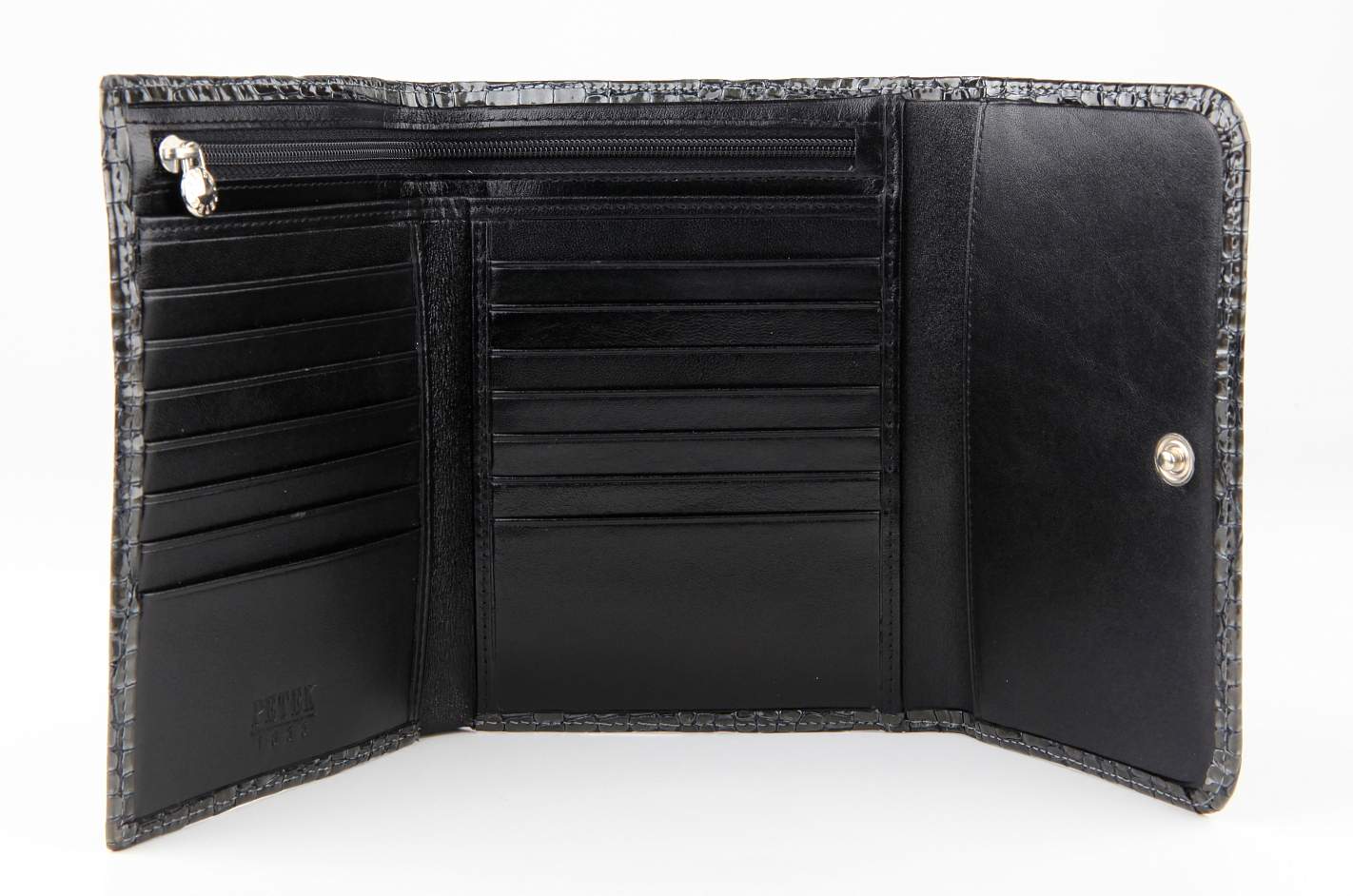 Женское элегантное Petek из натуральной кожи. Закрывается на кнопку. 2 отделения для купюр. Отделение для мелочи. 14 отделений для визитных и кредитных карт. 2 многофункциональных отделения.