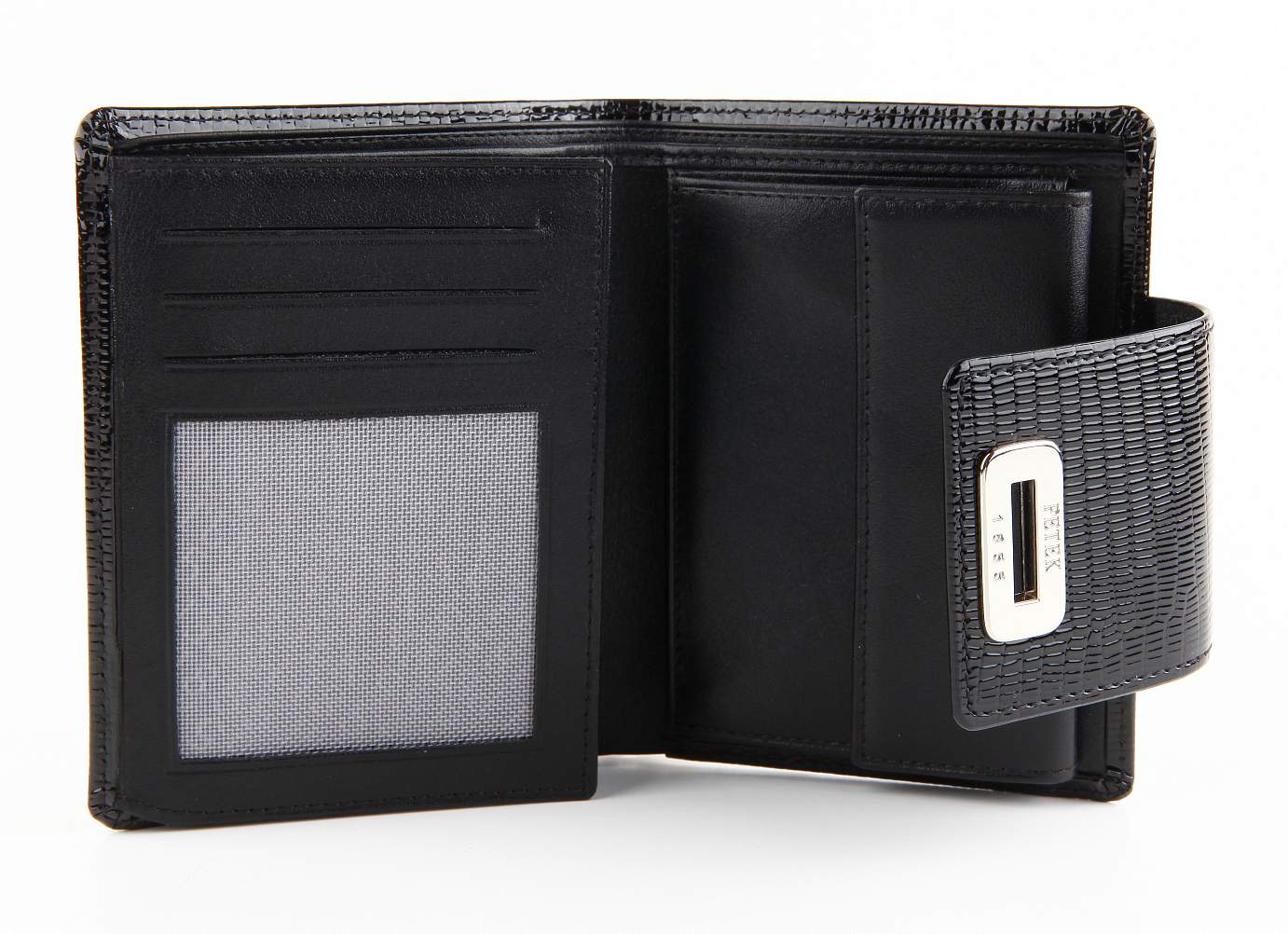 Портмоне женское. Закрывается хлястиком с замком. 2 отделения для купюр. Отделение для мелочи. 5 отделений для визитных и кредитных карт. 2 многофункциональных отделения. 2 отделения для документов из сетки.