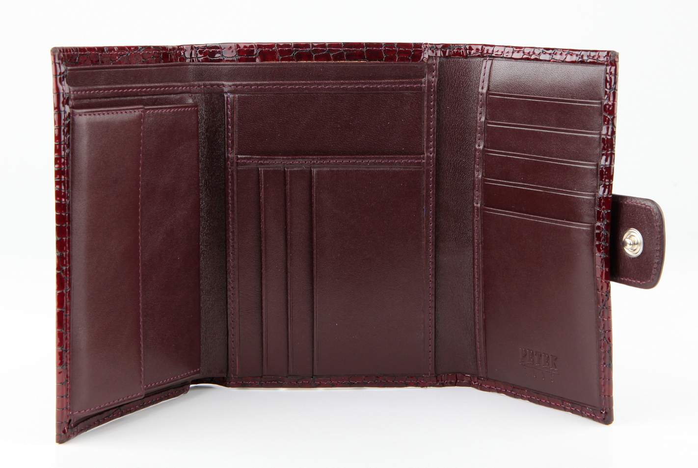 Женский элегантный кожаный кошелек Petek. Внутри есть отделение для купюр, 9 отделений для визиток/кредитных карт. Отделение для мелочи. Закрывается на кнопку.