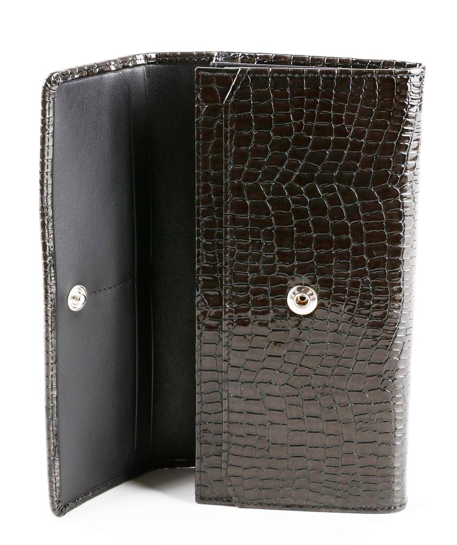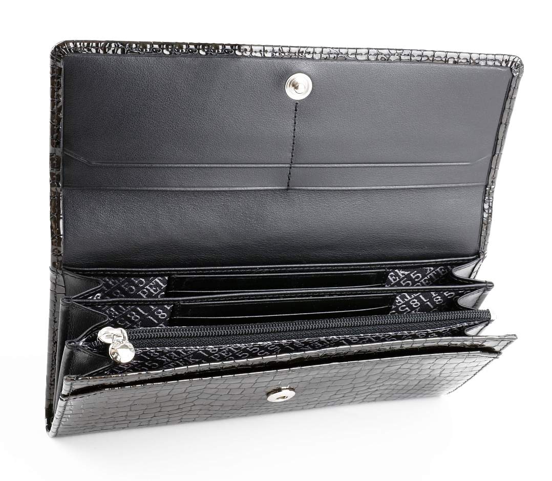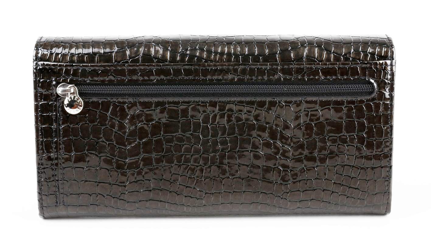 Отделение для мелочи снаружи на молнии. Один открытый кармашек снаружи кошелька. Три отделения для купюр, 1 отделение на молнии, 2 открытых кармашка, 12 отделения для кредитных карт.