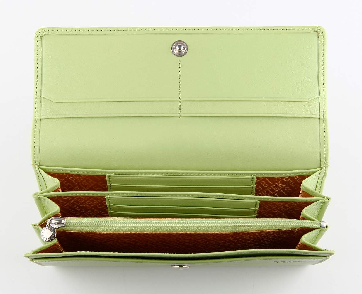 Отделение для мелочи снаружи на молнии. Один открытый кармашек снаружи кошелька. Три отделения для купюр, 1 отделение на молнии, 2 открытых кармашка, 12 отделения для кредитных карт.
