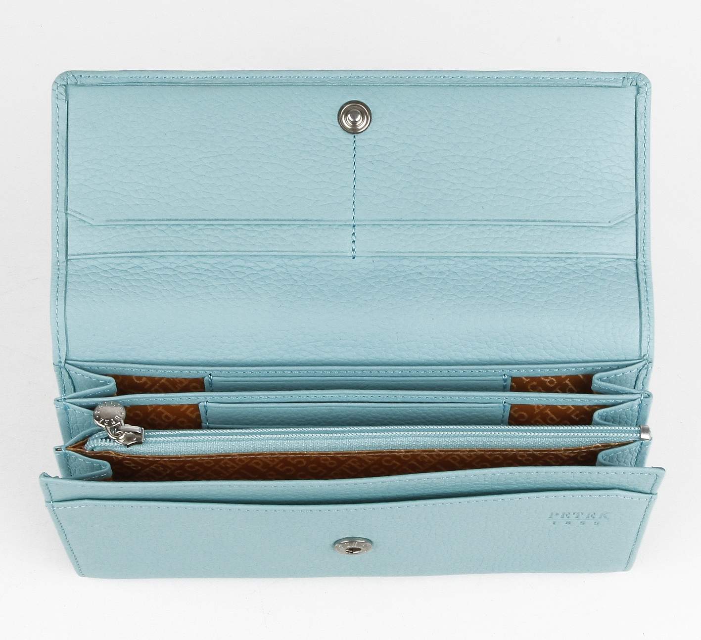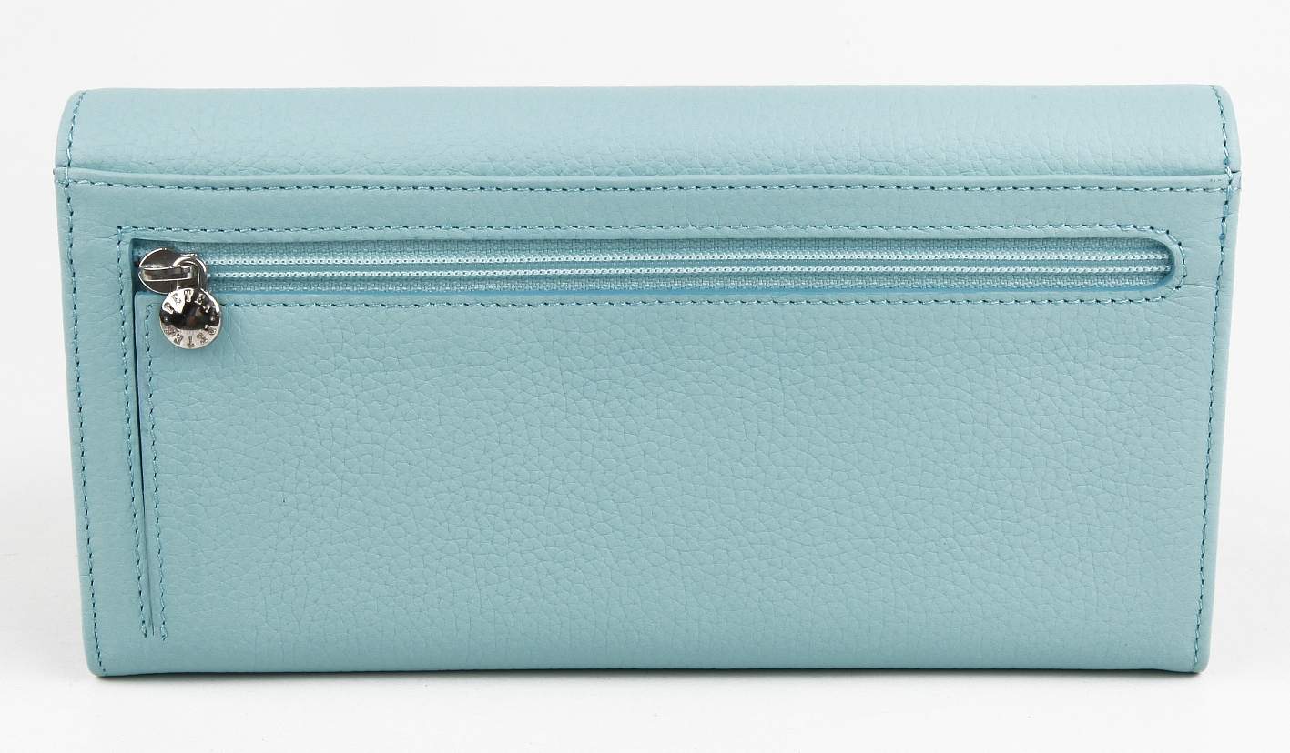 Отделение для мелочи снаружи на молнии. Один открытый кармашек снаружи кошелька. Три отделения для купюр, 1 отделение на молнии, 2 открытых кармашка, 12 отделения для кредитных карт.