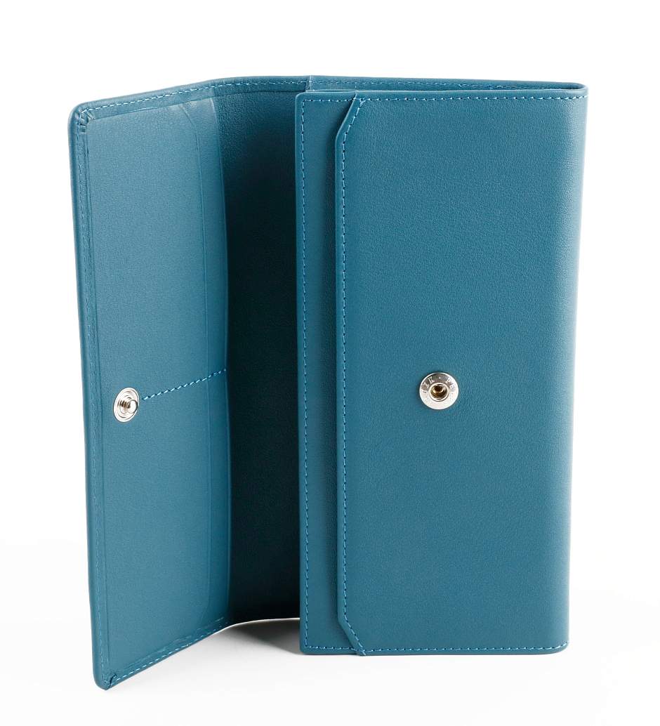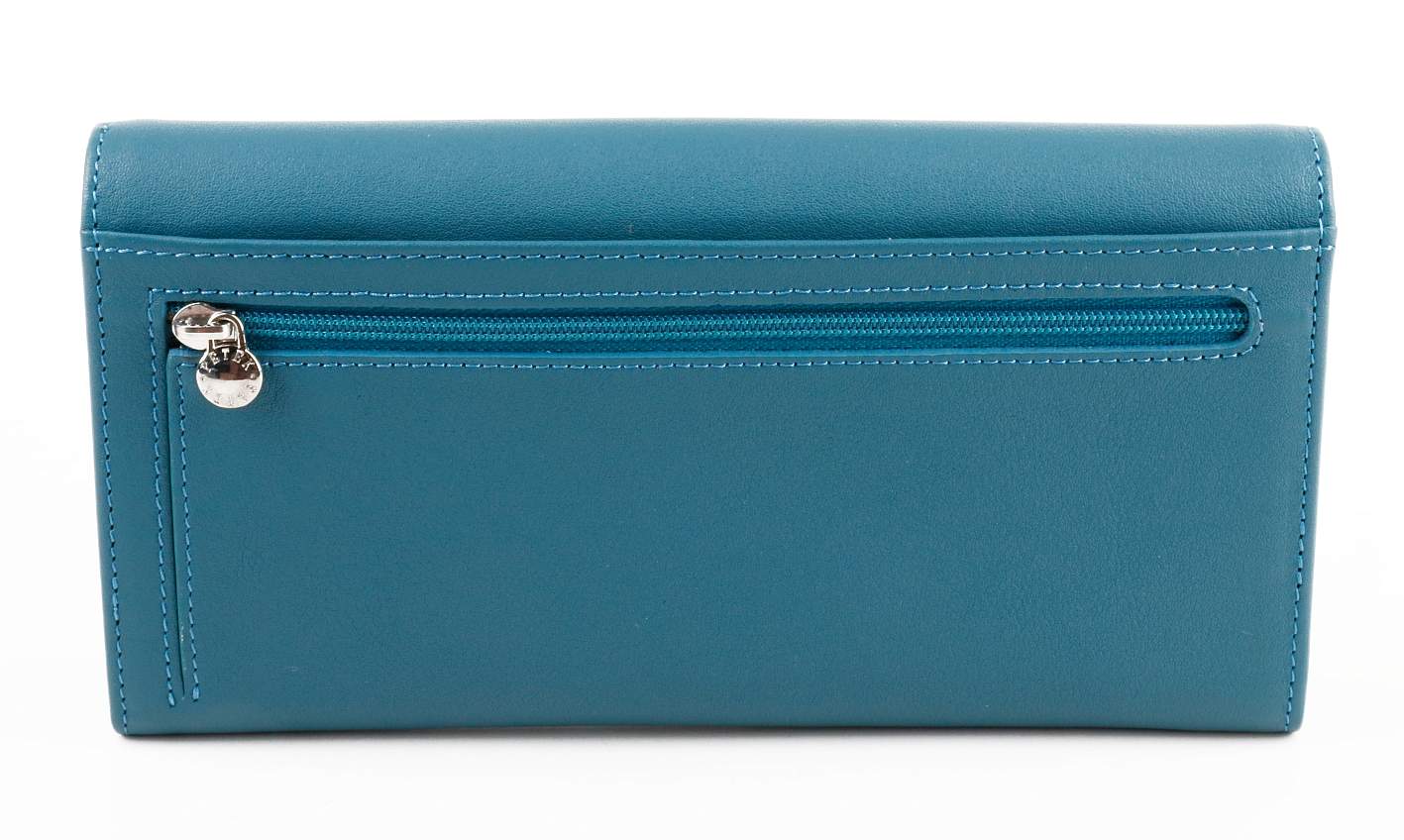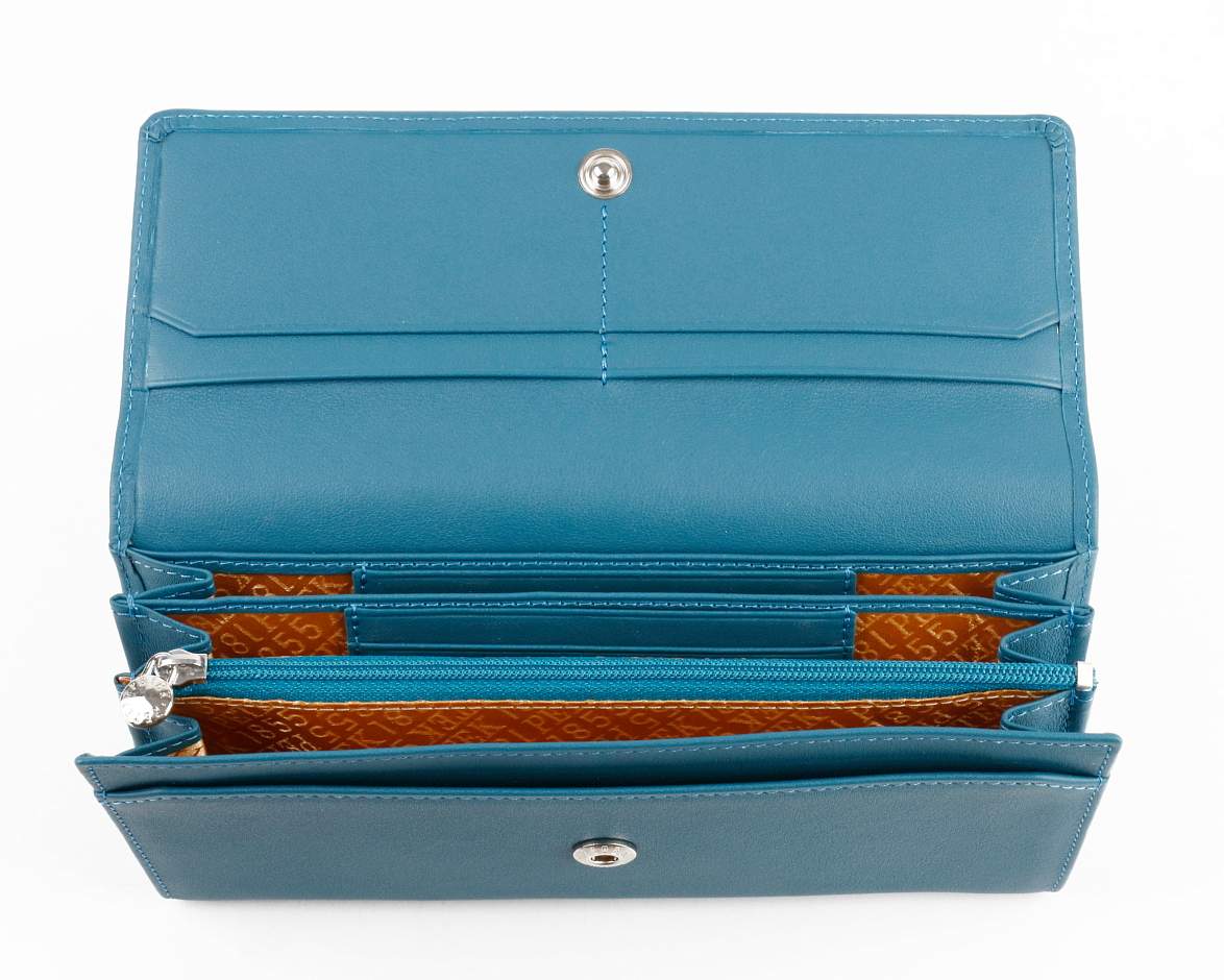 Отделение для мелочи снаружи на молнии. Один открытый кармашек снаружи кошелька. Три отделения для купюр, 1 отделение на молнии, 2 открытых кармашка, 12 отделения для кредитных карт.