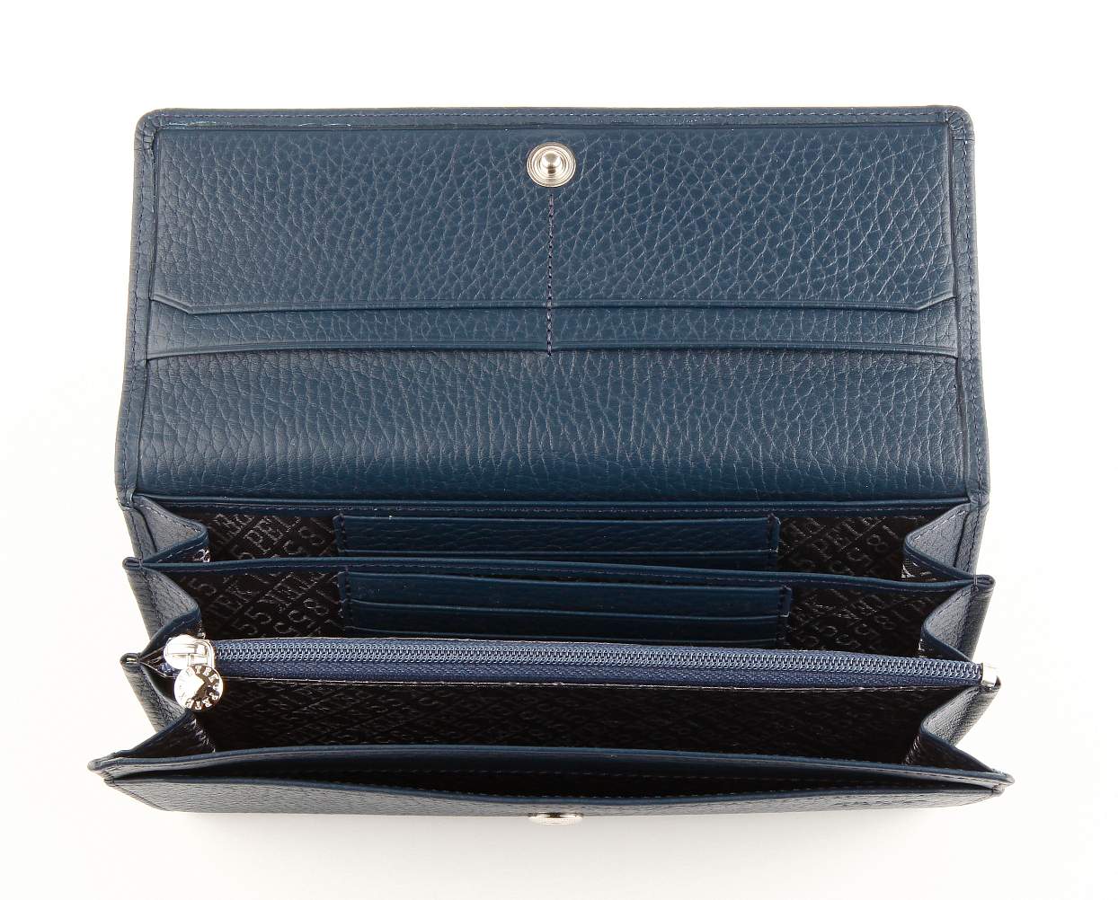 Отделение для мелочи снаружи на молнии. Один открытый кармашек снаружи кошелька. Три отделения для купюр, 1 отделение на молнии, 2 открытых кармашка, 12 отделения для кредитных карт.