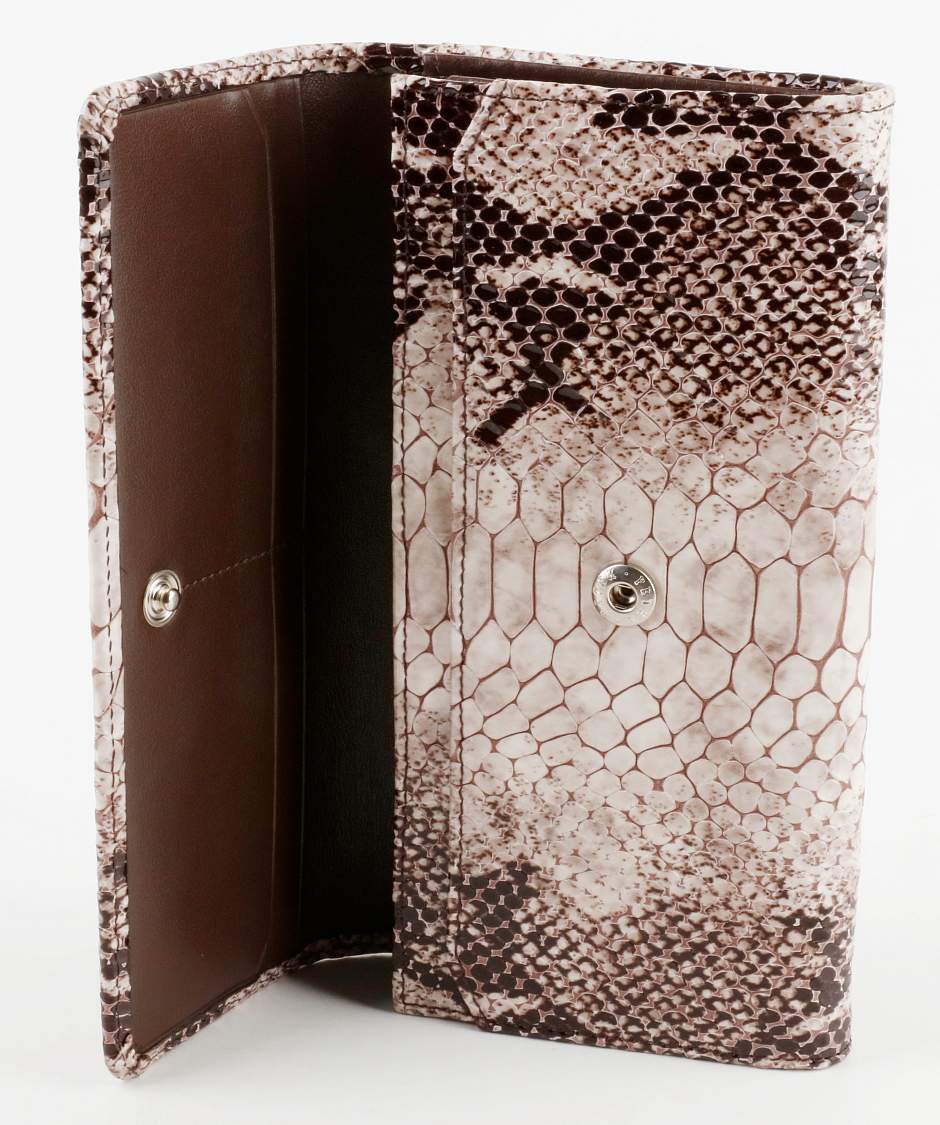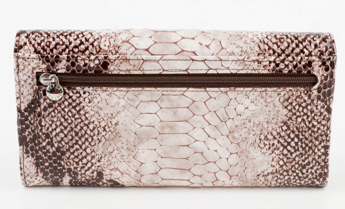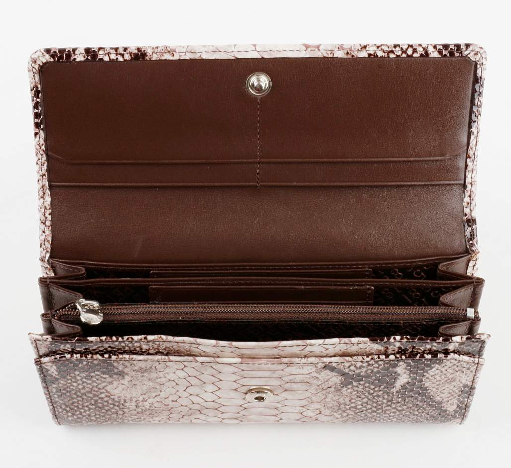 Отделение для мелочи снаружи на молнии. Один открытый кармашек снаружи кошелька. Три отделения для купюр, 1 отделение на молнии, 2 открытых кармашка, 12 отделения для кредитных карт.