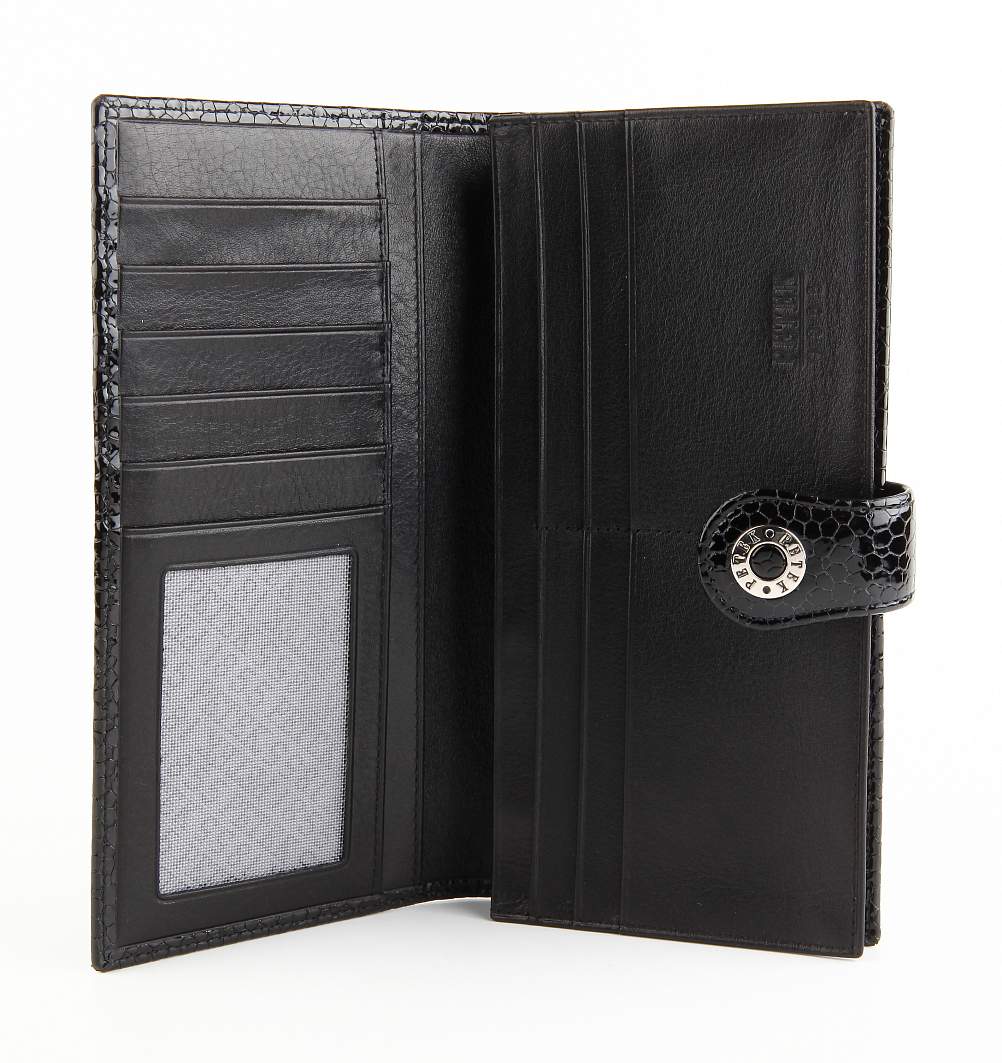 Утонченное портмоне из натуральной кожи. Внутри один просторный блок для купюр. Монетница в этой модели отсутствует. Большое количество кармашков для пластиковых карт, карман с сеточным окошком и два длинных многофункциональных отделения.