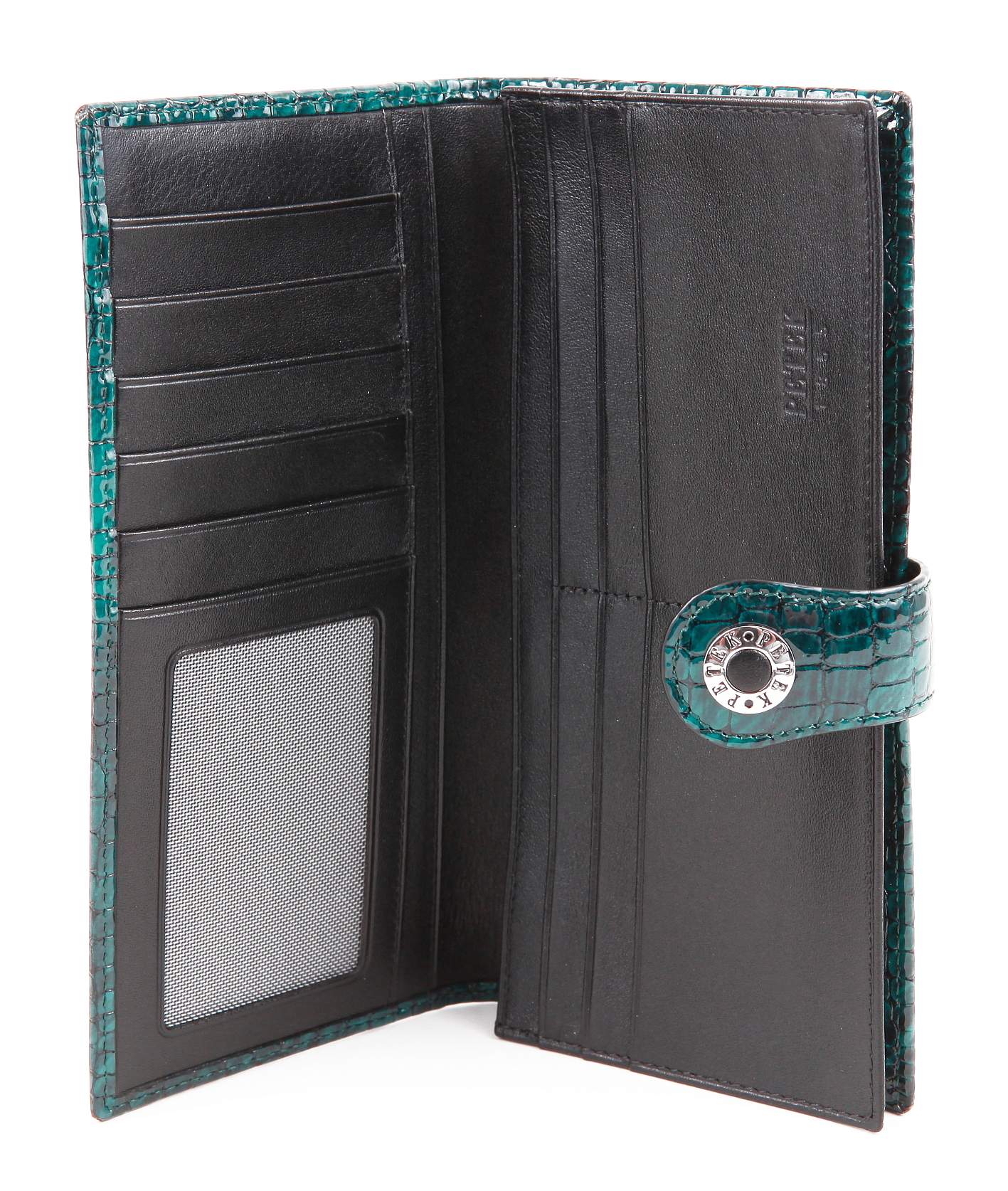 Утонченное портмоне из натуральной кожи. Внутри один просторный блок для купюр. Монетница в этой модели отсутствует. Большое количество кармашков для пластиковых карт, карман с сеточным окошком и два длинных многофункциональных отделения.
