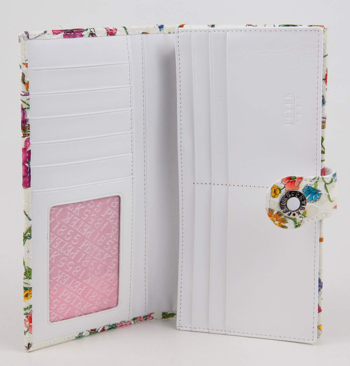 Утонченное портмоне из натуральной кожи. Внутри один просторный блок для купюр. Монетница в этой модели отсутствует. Большое количество кармашков для пластиковых карт, карман с сеточным окошком и два длинных многофункциональных отделения.