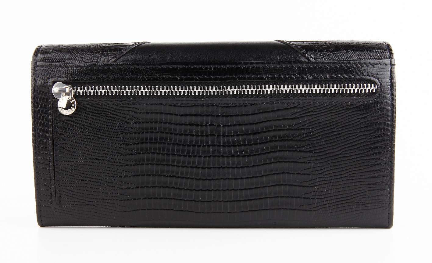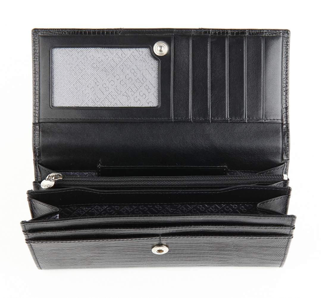 Закрывается клапаном на кнопку, внутри - 3 отделения для купюр, центральное отделение на молнии, 9 отделений для карт, внешний карман на обратной стороне для мелочи - на молнии, с расширением в виде конверта для более удобного доступа к монетам.
