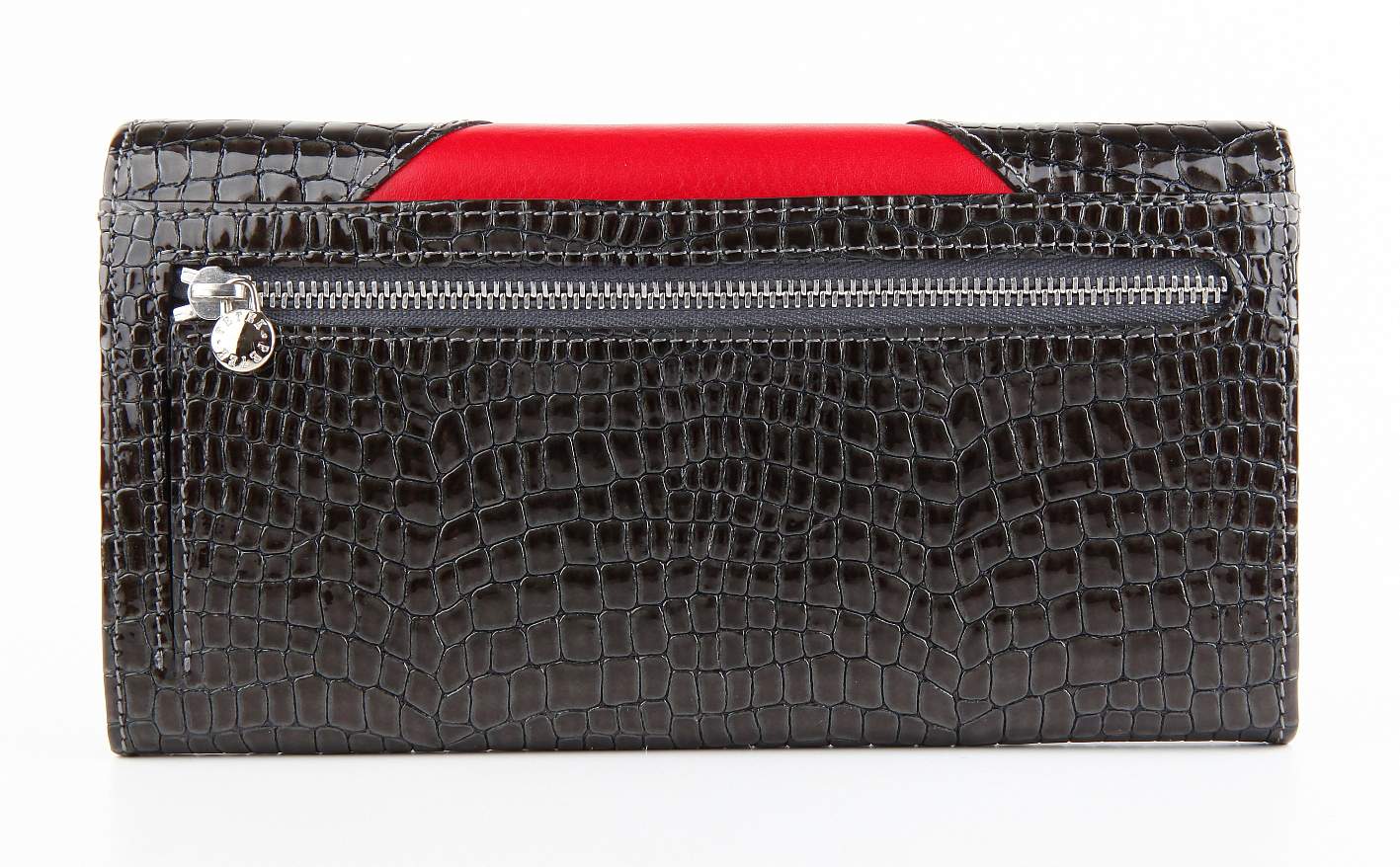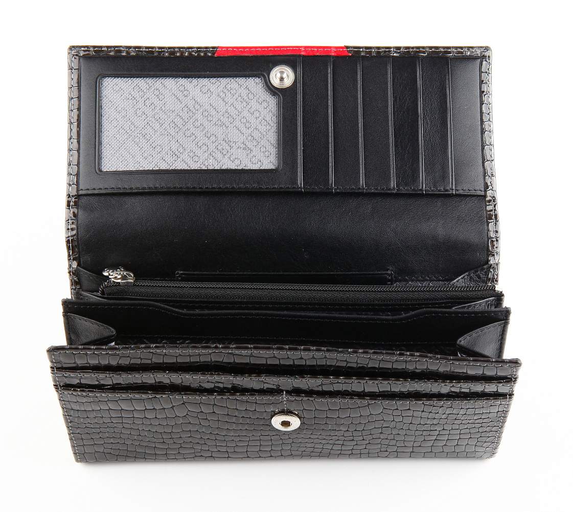 Закрывается клапаном на кнопку, внутри - 3 отделения для купюр, центральное отделение на молнии, 9 отделений для карт, внешний карман на обратной стороне для мелочи - на молнии, с расширением в виде конверта для более удобного доступа к монетам.