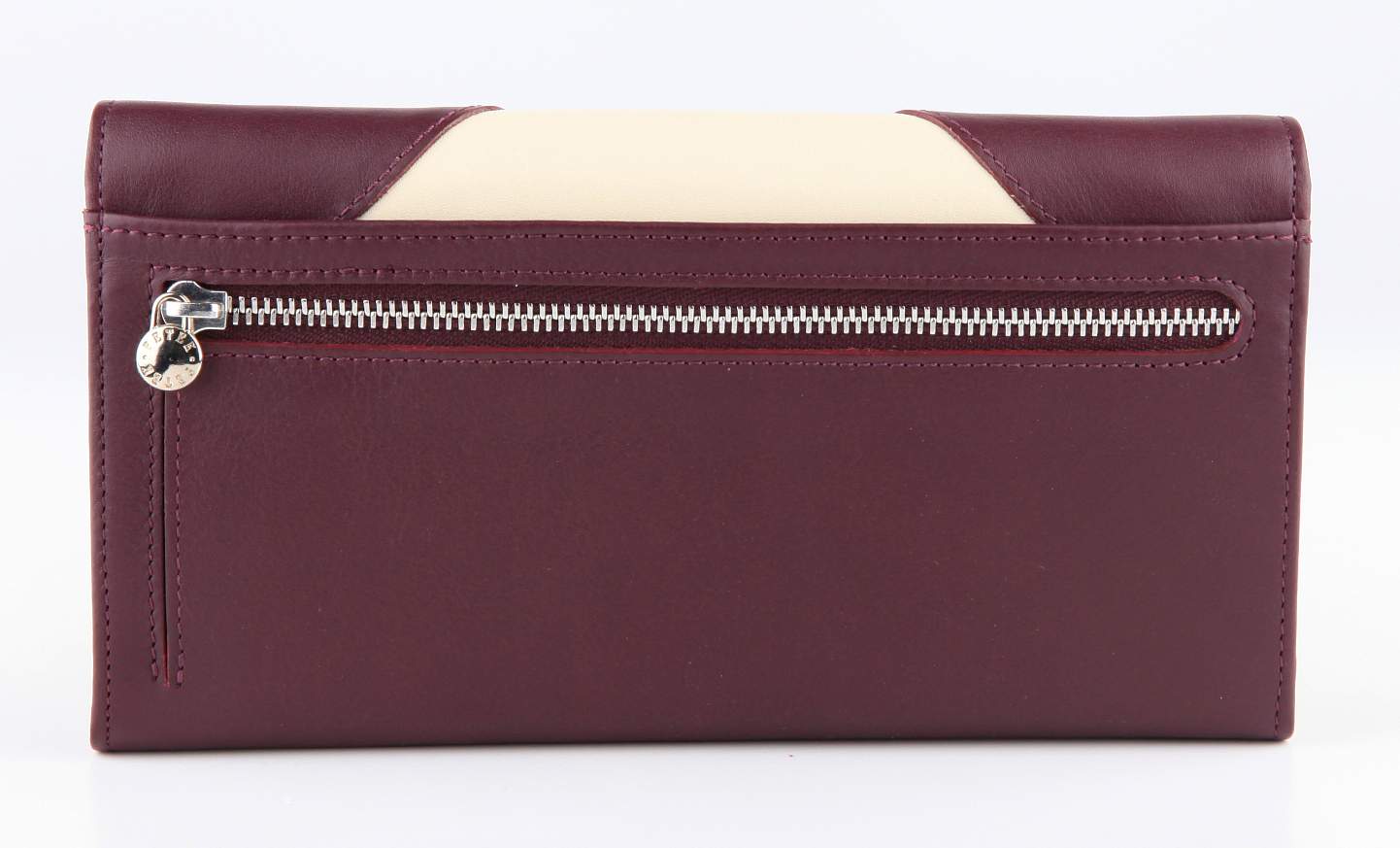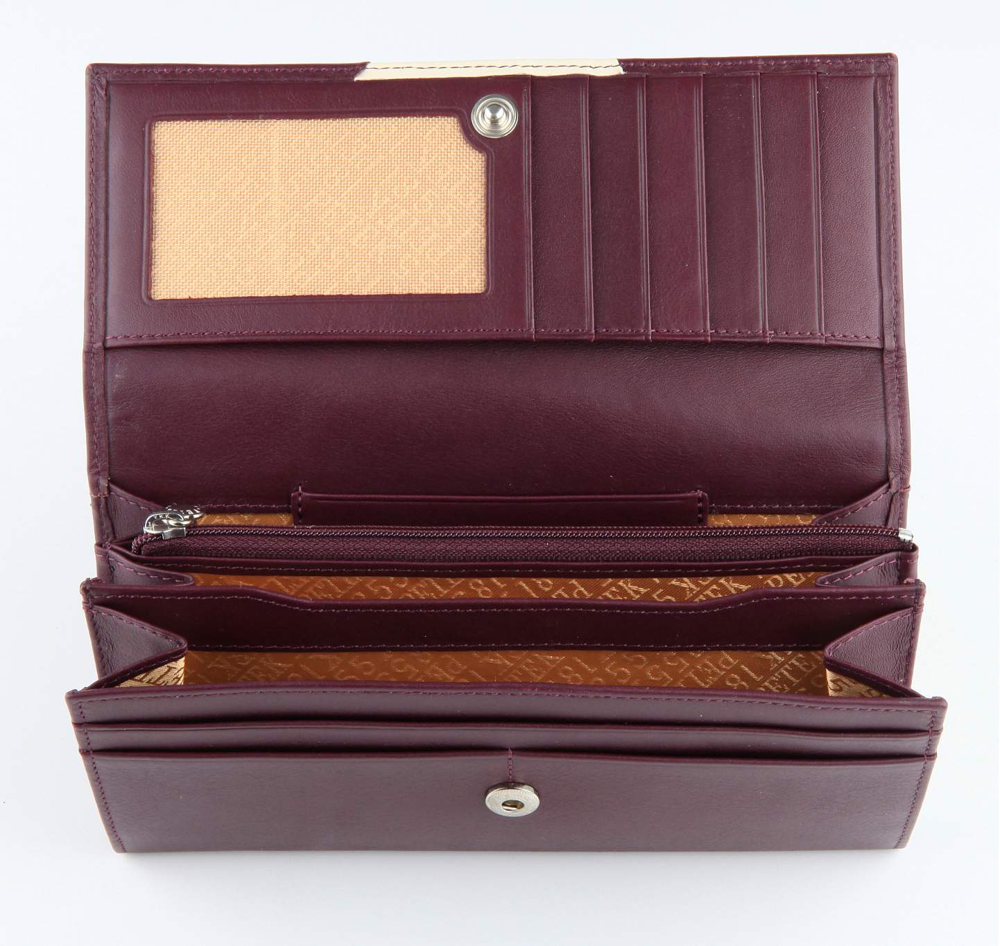 Закрывается клапаном на кнопку, внутри - 3 отделения для купюр, центральное отделение на молнии, 9 отделений для карт, внешний карман на обратной стороне для мелочи - на молнии, с расширением в виде конверта для более удобного доступа к монетам.