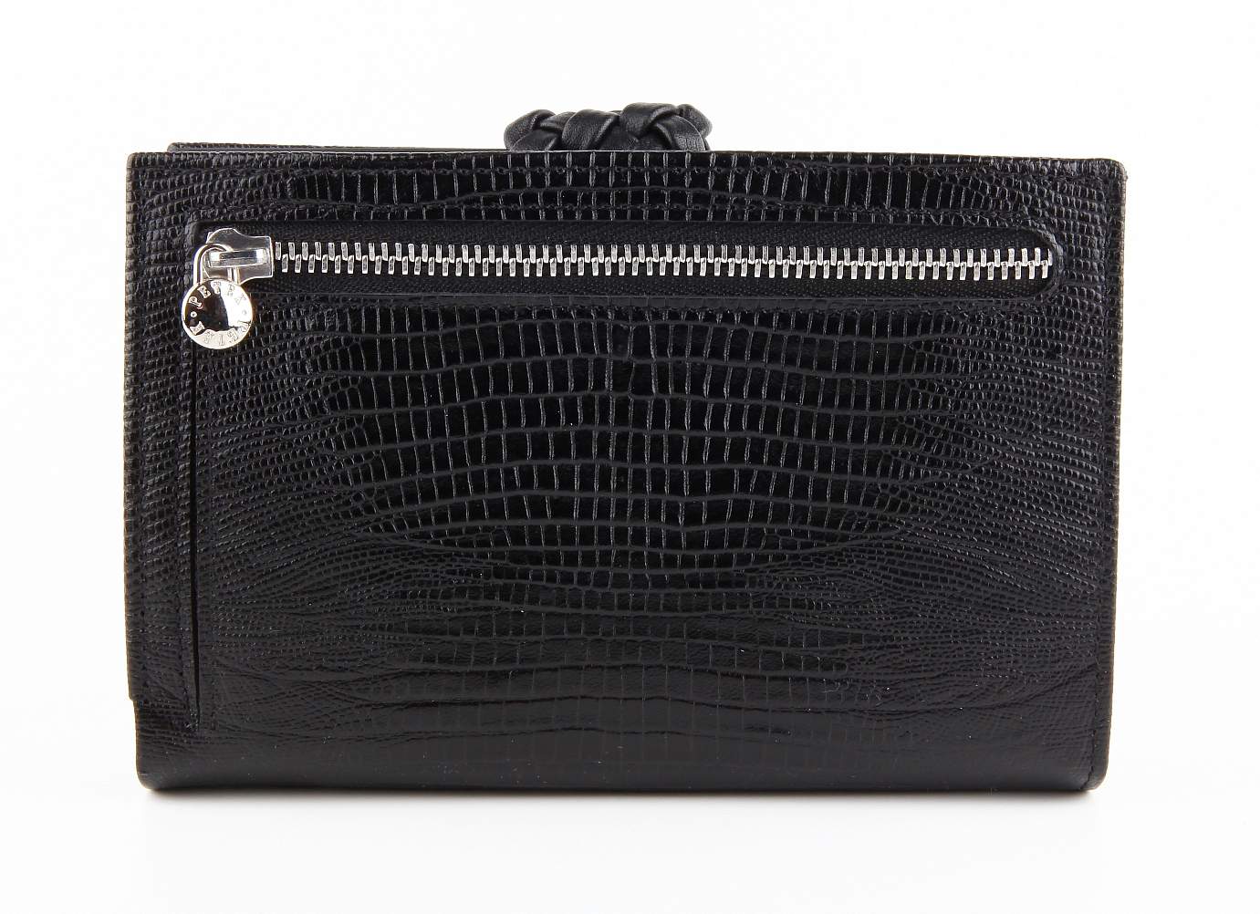Очень необычная модель. Фактура кожи и плетёный хлястик на который закрывается портмоне задают стиль этой модели. Вместительная монетница закрывается на молнию, а за откидным отделением с крепкой прозрачной сеткой, что позволят хранить в нём документы которые необходимо часто предъявлять, есть кармашки для пяти кредитных или дисконтных карт. Сзади, во всю площадь этой модели располагается карман закрывающийся на молнию. Очень стильно выглядит, а главное, удобно.