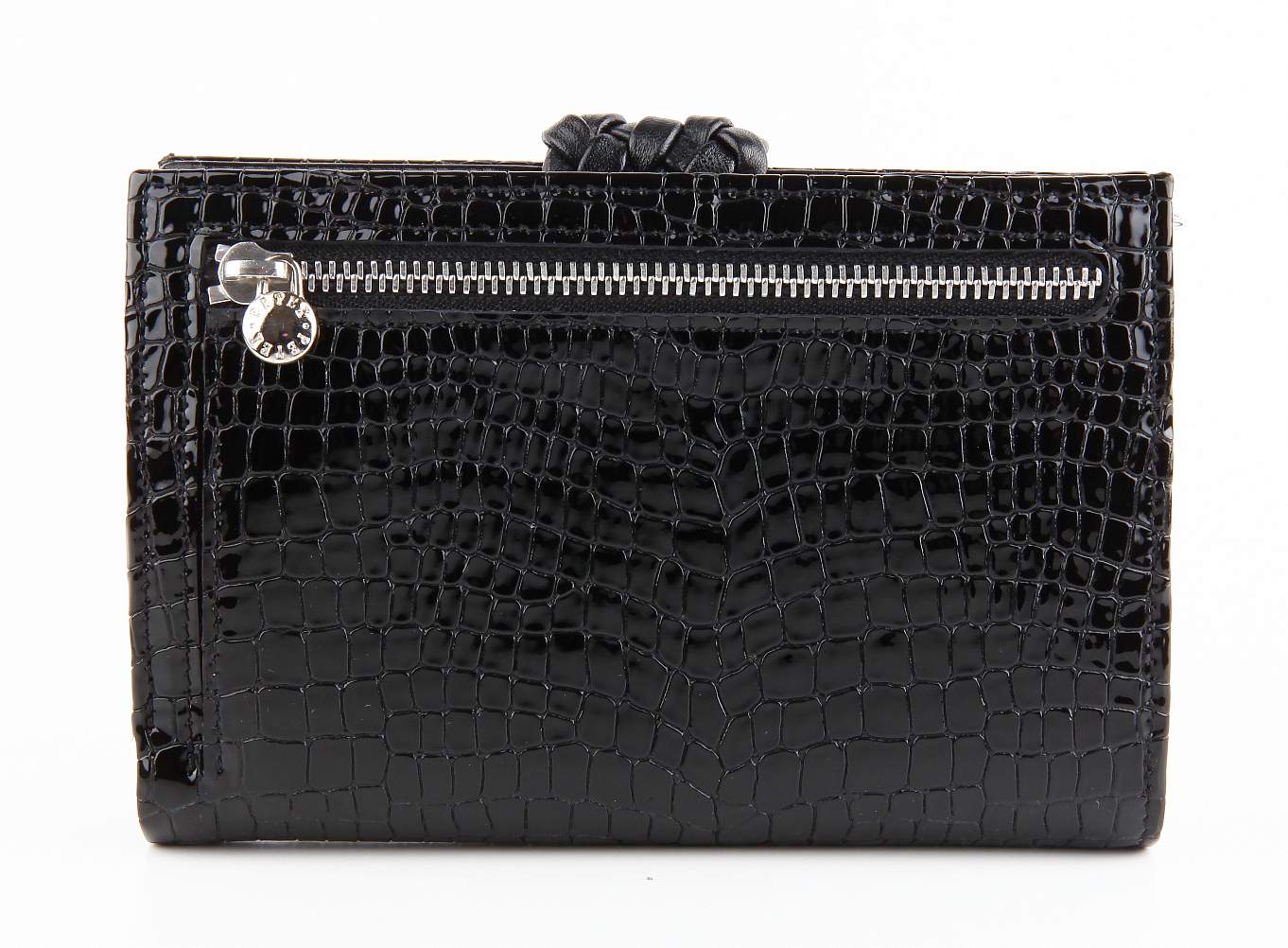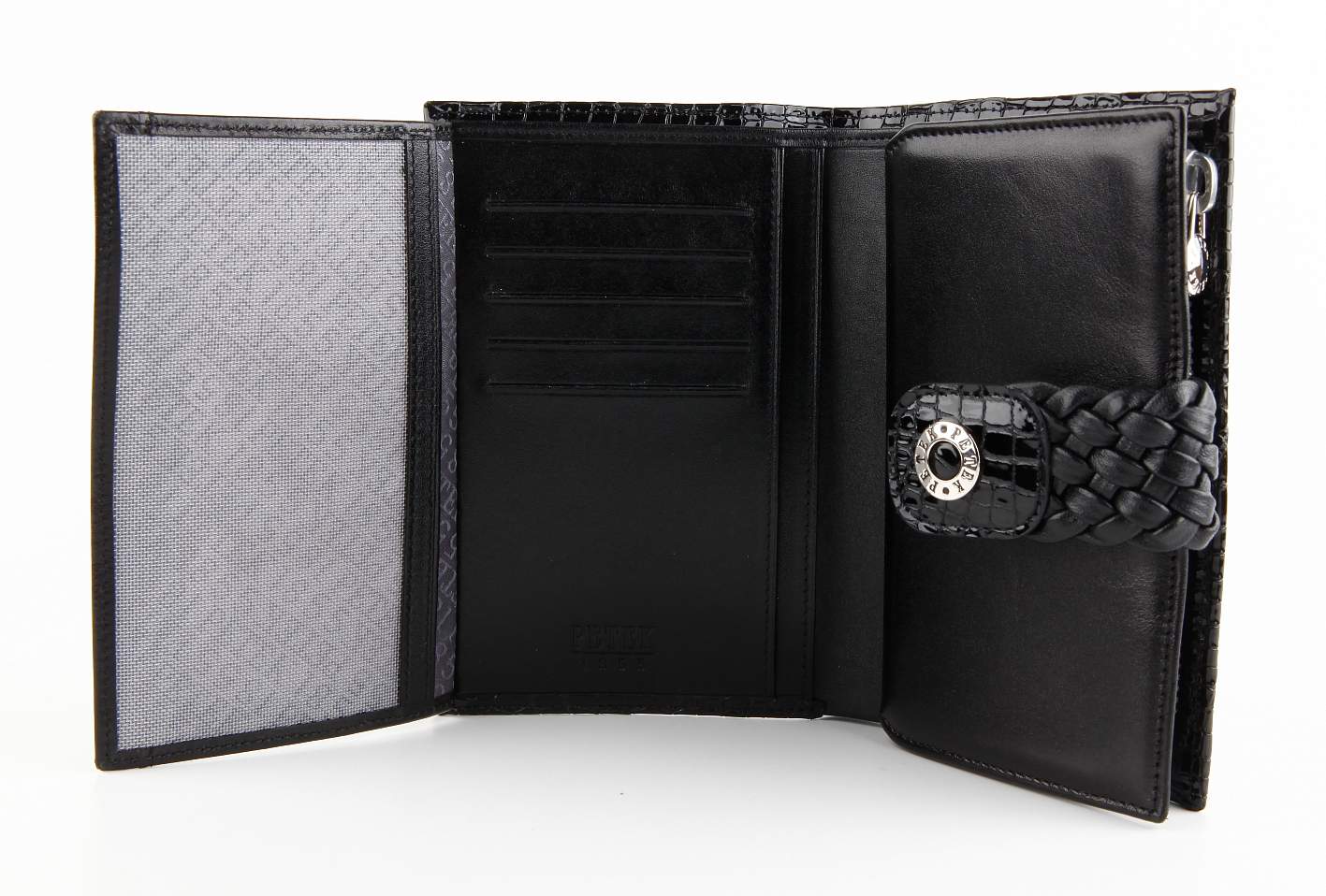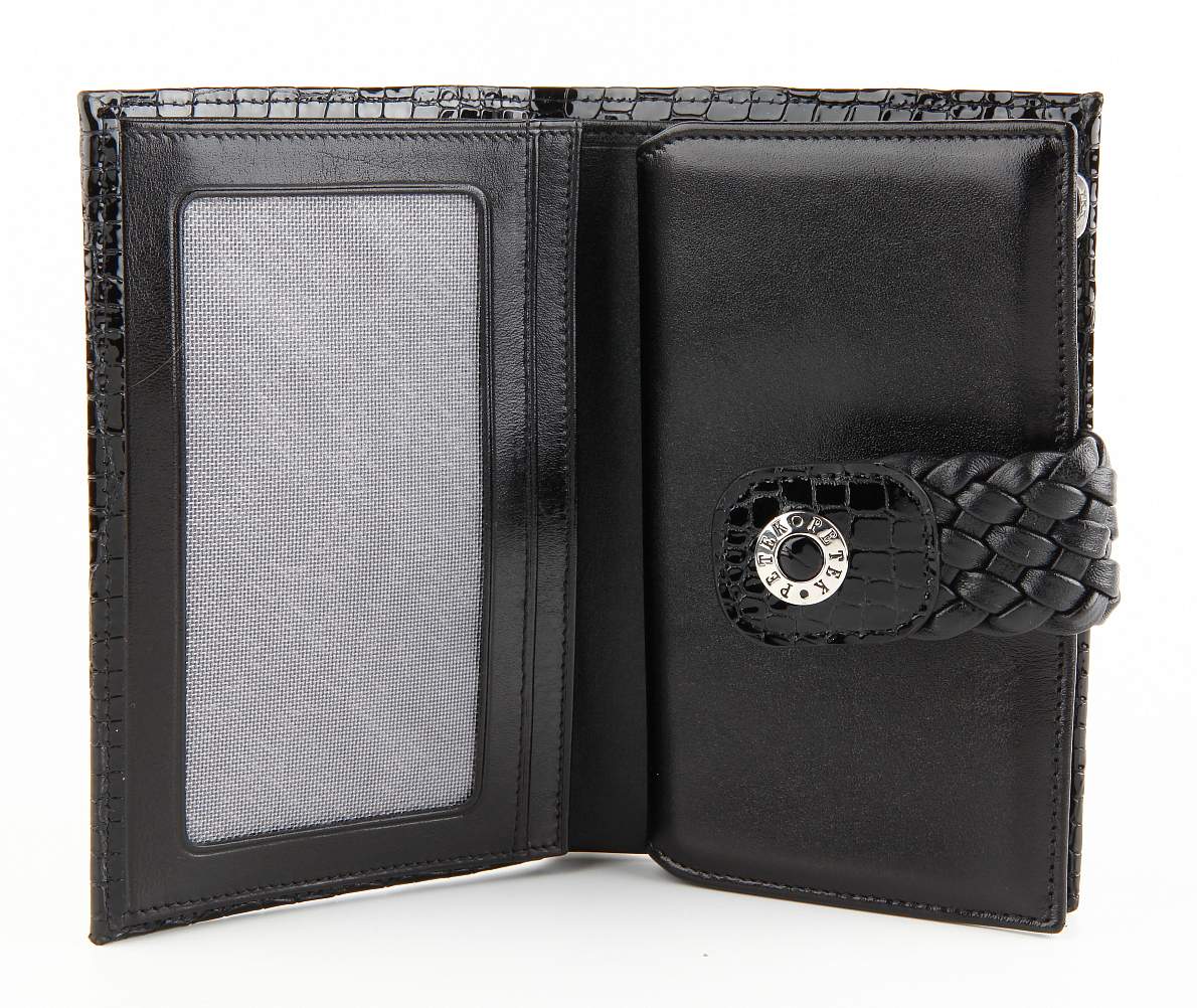 Очень необычная модель. Фактура кожи и плетёный хлястик на который закрывается портмоне задают стиль этой модели. Вместительная монетница закрывается на молнию, а за откидным отделением с крепкой прозрачной сеткой, что позволят хранить в нём документы которые необходимо часто предъявлять, есть кармашки для пяти кредитных или дисконтных карт. Сзади, во всю площадь этой модели располагается карман закрывающийся на молнию. Очень стильно выглядит, а главное, удобно.
