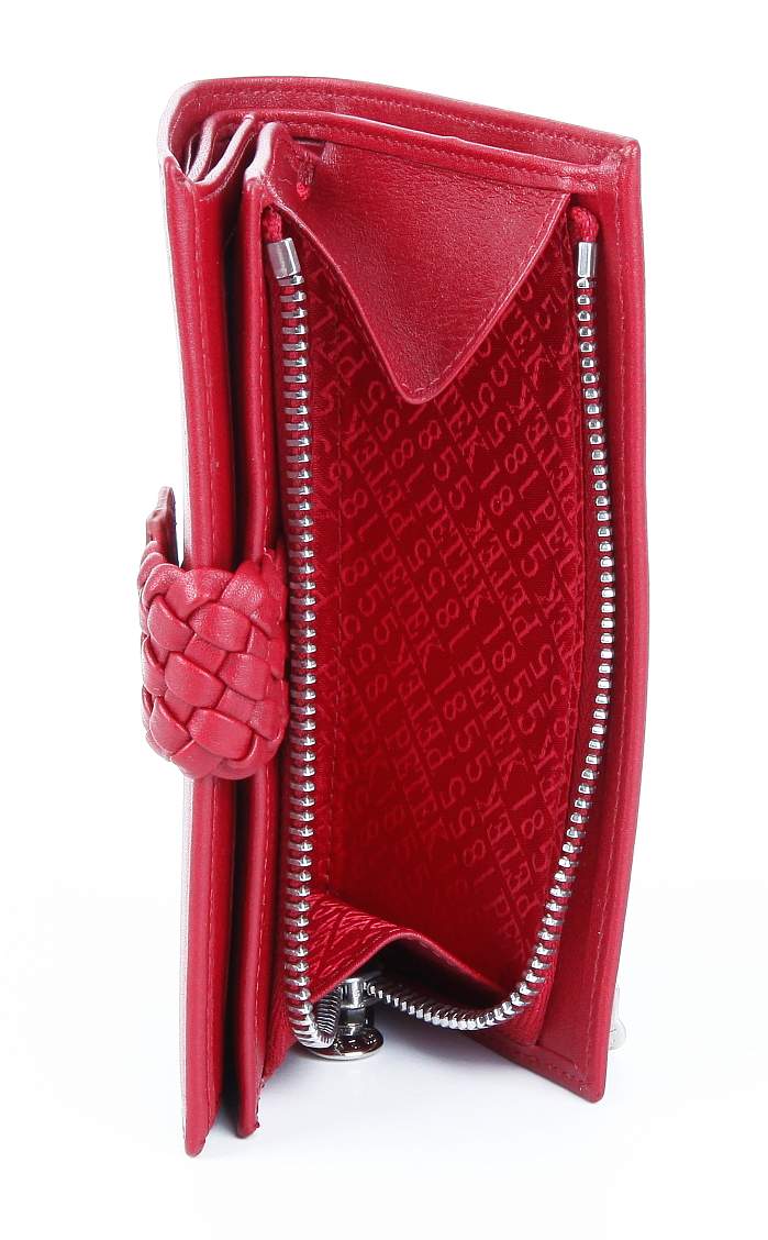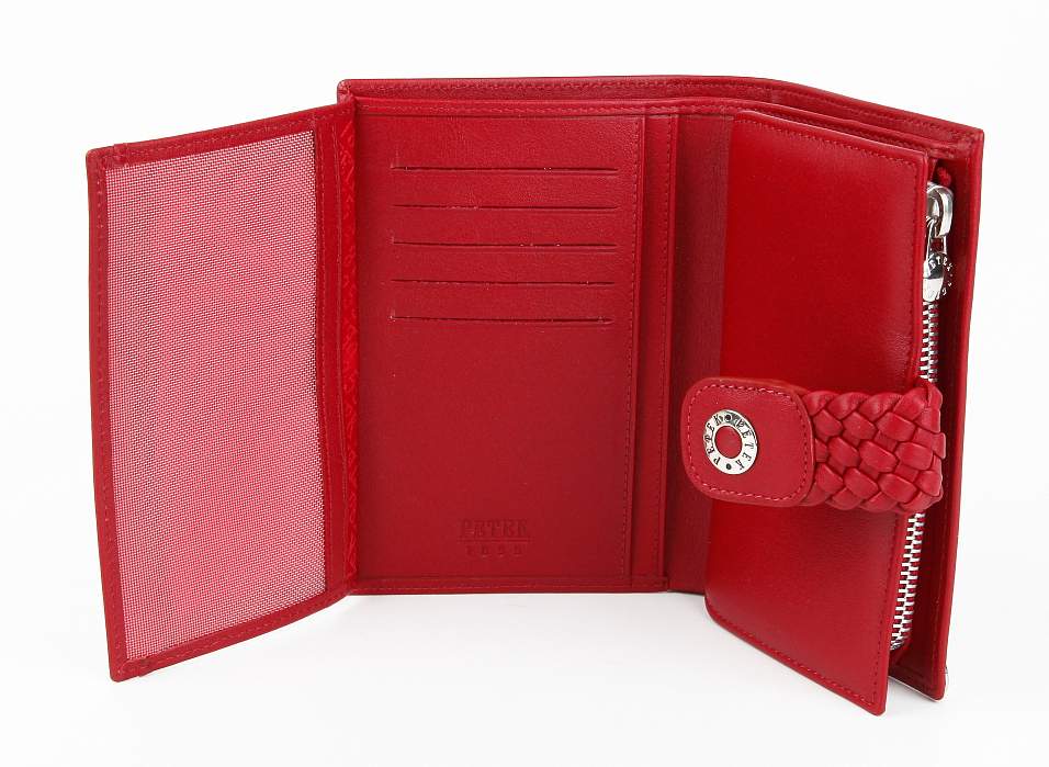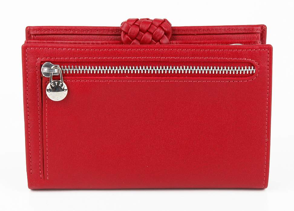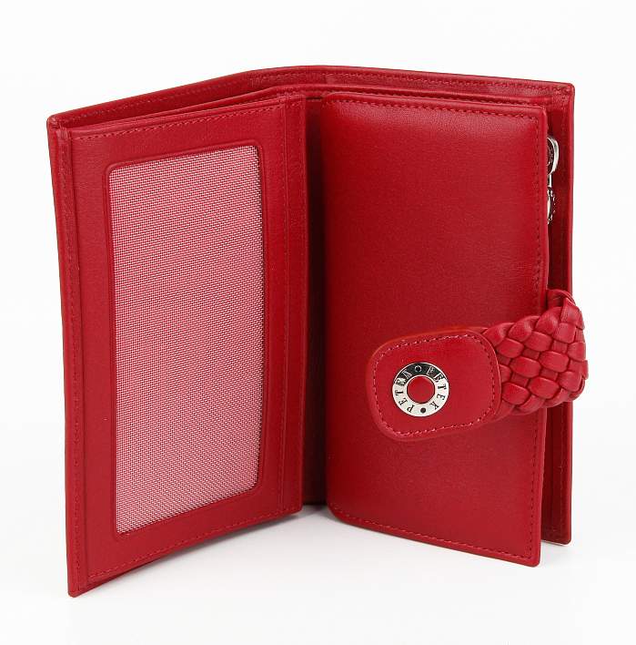 Очень необычная модель. Фактура кожи и плетёный хлястик на который закрывается портмоне задают стиль этой модели. Вместительная монетница закрывается на молнию, а за откидным отделением с крепкой прозрачной сеткой, что позволят хранить в нём документы которые необходимо часто предъявлять, есть кармашки для пяти кредитных или дисконтных карт. Сзади, во всю площадь этой модели располагается карман закрывающийся на молнию. Очень стильно выглядит, а главное, удобно.