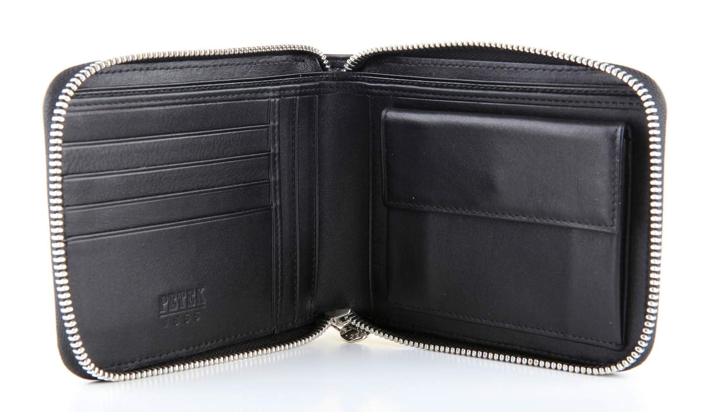 Женский кошелек Petek из натуральной кожи лучшего качества. Оригинальная модель кожаного кошелька, закрывается по периметру на крупную молнию, украшена фирменной пряжкой с рельефным логотипом «Petek 1855». Внутри: отделение для купюр, 4 отделения для пластиковых карт, отделение для монет на кнопке, 4 дополнительных кармана для важных мелких бумаг.