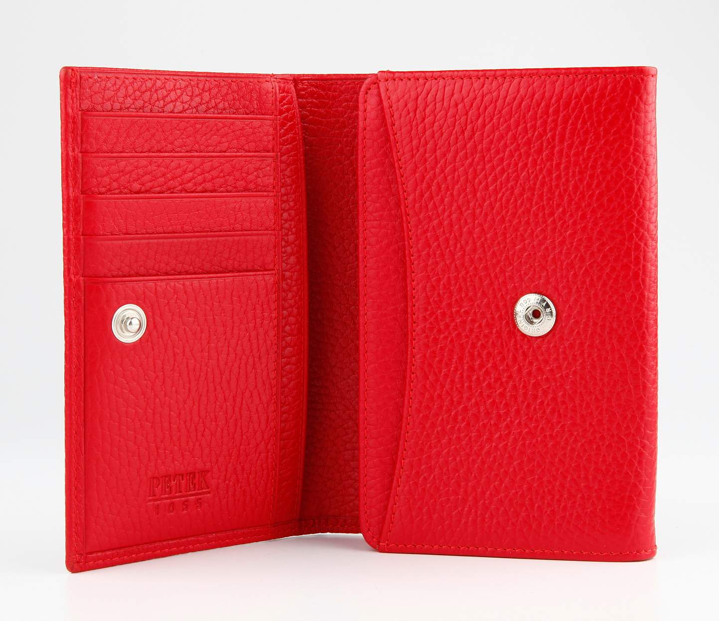 Женское портмоне из натуральной кожи. Модель закрывается на кнопку, есть дополнительный внешний карман. Для мелочи предусмотрено два отделения, одно из которых закрывается на молнию. Имеется три внутренних потайных кармана.