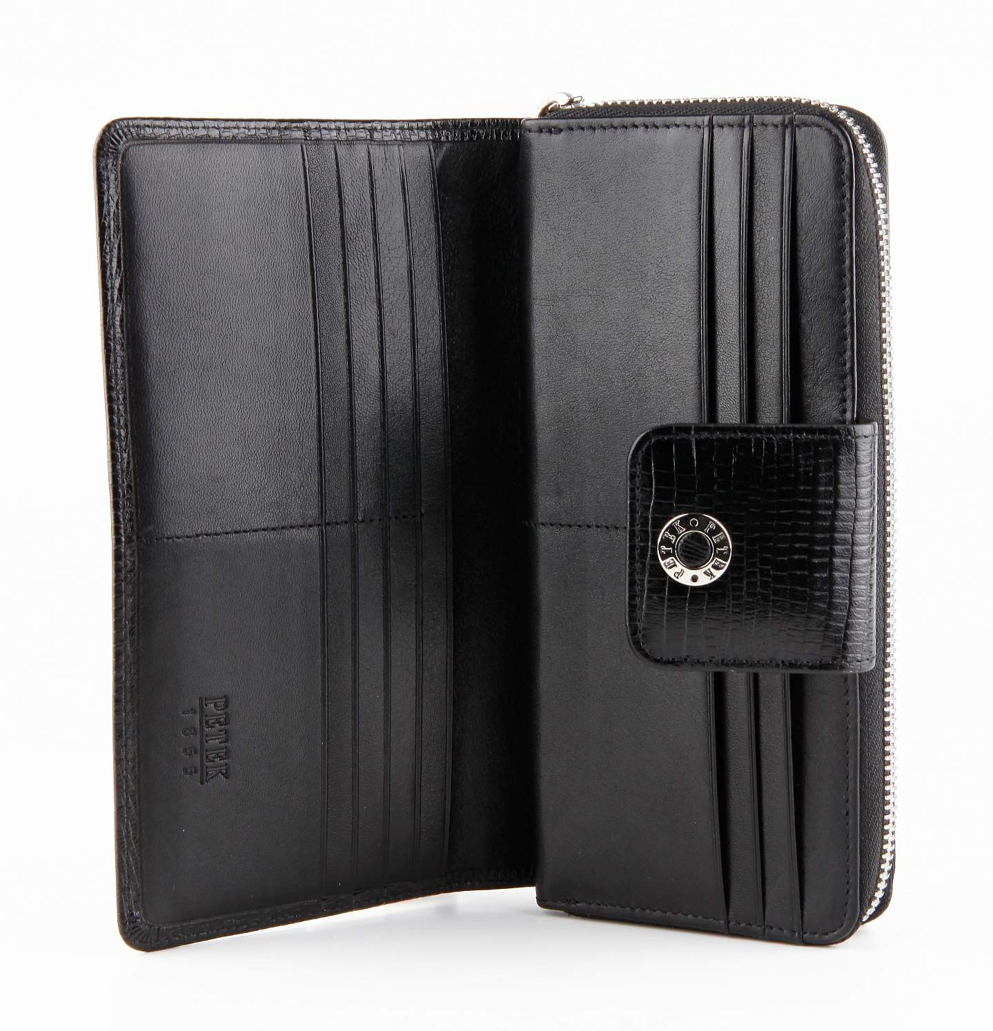 Кожаный кошелек Petek имеет общее отделение, которое закрывается на молнию и дополнительную откидную часть, которая закрывается на шлевку с кнопкой. Внутри кошелька имеются три отделения для банкнот, одно из которых на молнии и 14 отсеков для кредитных карт / визиток, а также продольные кармашки для документов. Снаружи на обратной стороне кошелька находится карман для монет, который закрывается на молнию.