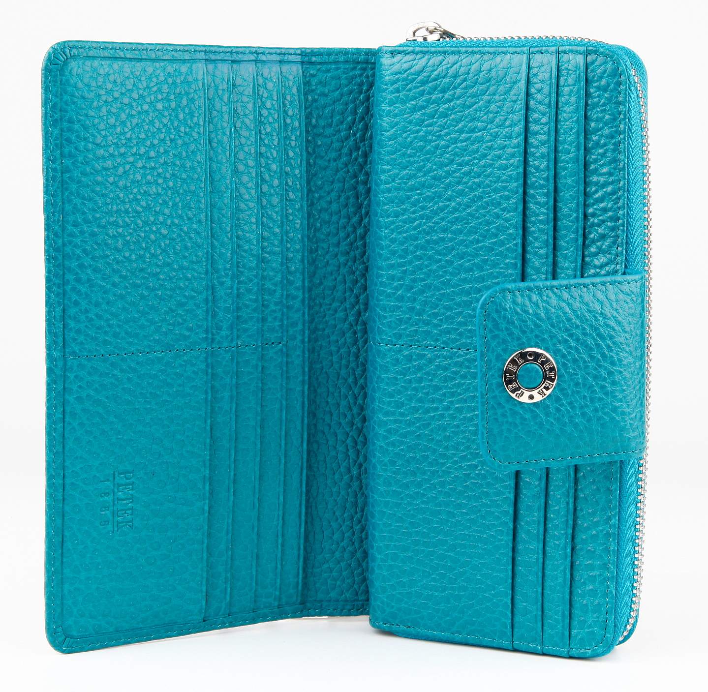 Кожаный кошелек Petek имеет общее отделение, которое закрывается на молнию и дополнительную откидную часть, которая закрывается на шлевку с кнопкой. Внутри кошелька имеются три отделения для банкнот, одно из которых на молнии и 14 отсеков для кредитных карт / визиток, а также продольные кармашки для документов. Снаружи на обратной стороне кошелька находится карман для монет, который закрывается на молнию.