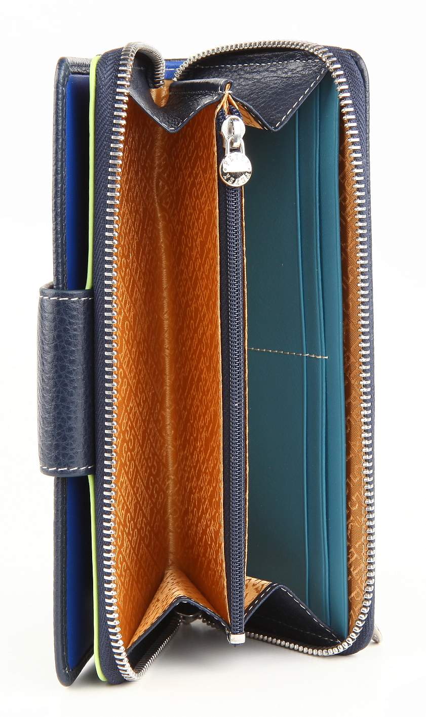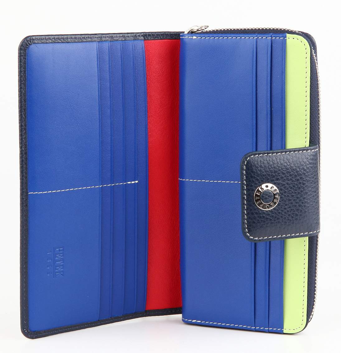Кожаный кошелек Petek имеет общее отделение, которое закрывается на молнию и дополнительную откидную часть, которая закрывается на шлевку с кнопкой. Внутри кошелька имеются три отделения для банкнот, одно из которых на молнии и 14 отсеков для кредитных карт / визиток, а также продольные кармашки для документов. Снаружи на обратной стороне кошелька находится карман для монет, который закрывается на молнию.