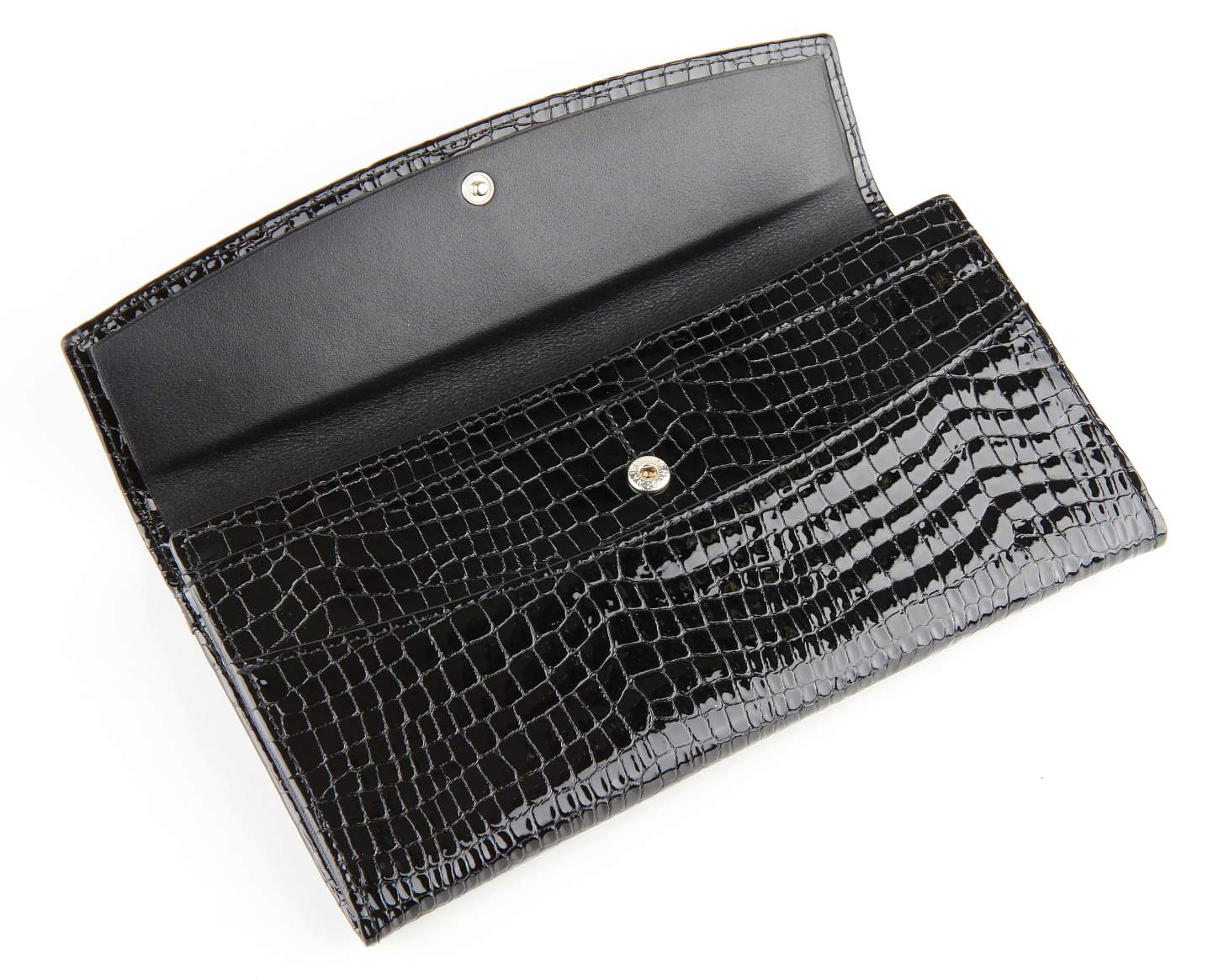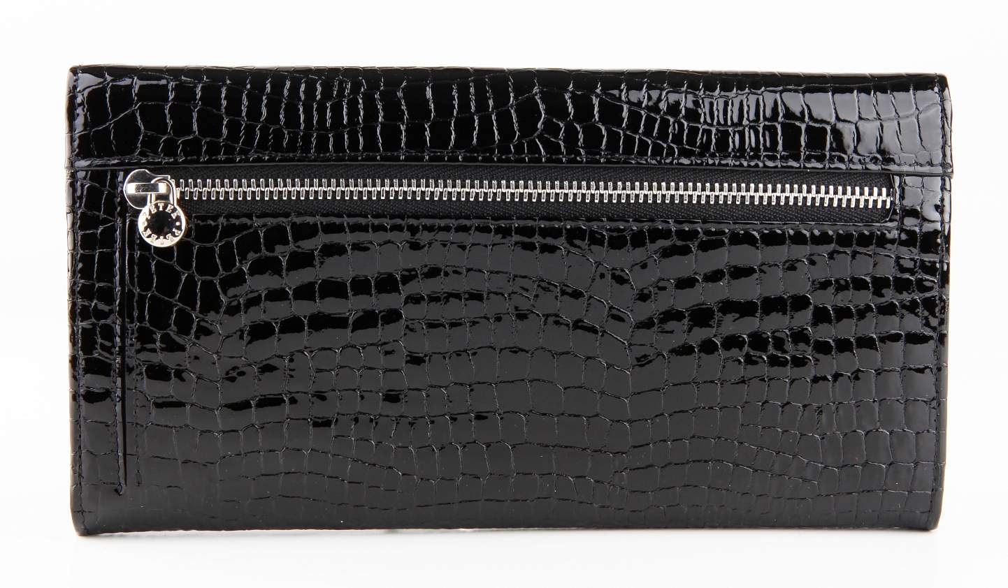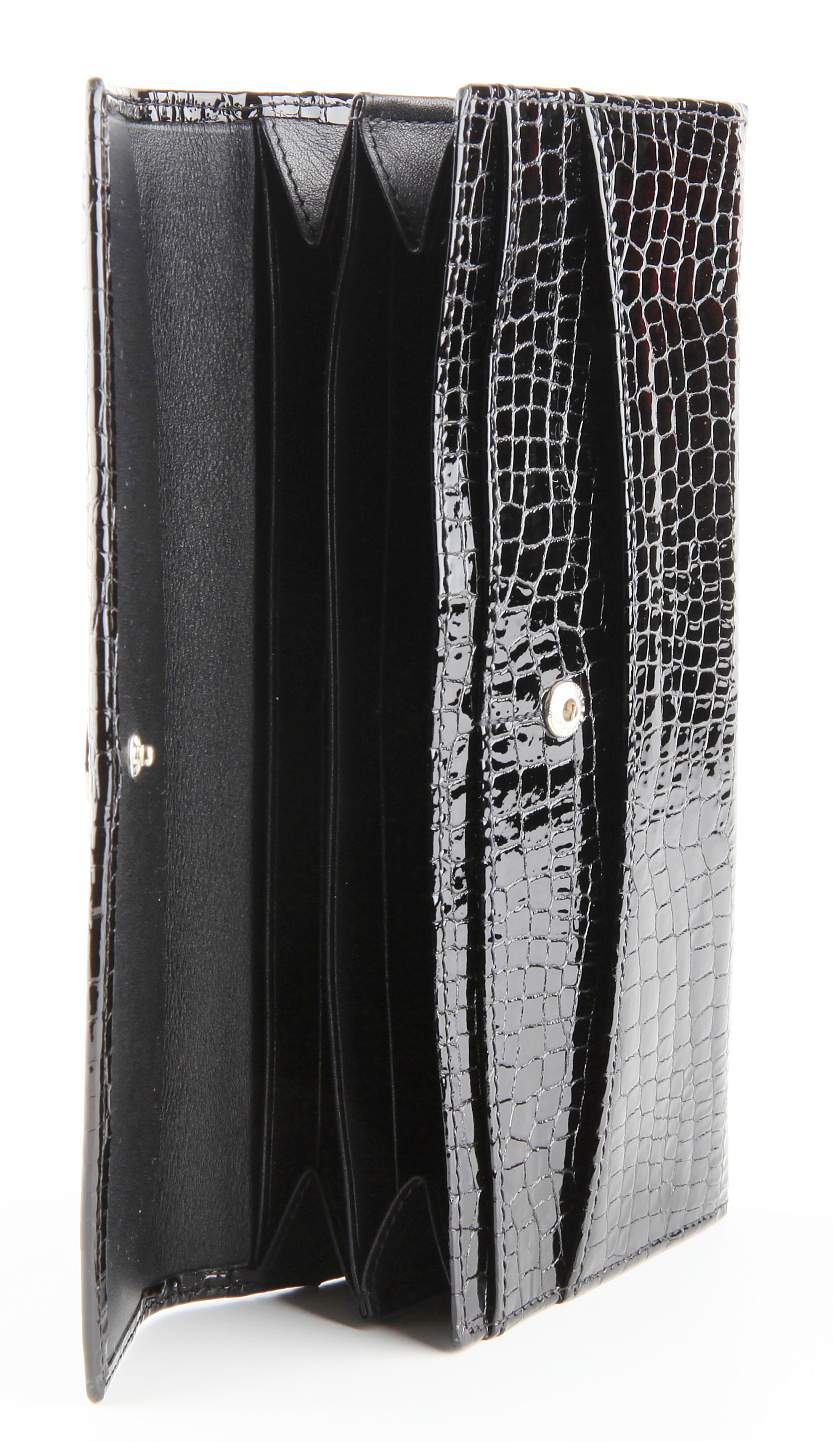 Женское портмоне из натуральной кожи, сочетающее в себе классический стиль и функциональность. Внутри портмоне предусмотрено два отделения купюр любого номинала, двенадцать прорезных карманов для кредитных и дисконтных карточек. На фронтальной части расположены два дополнительных отделения, одно из которых имеет оригинальный, полуовальный контур. В этой модели монетница, закрывающаяся на молнию, вынесена на внешнюю стенку. Портмоне закрывается на кнопку с логотипом Petek.