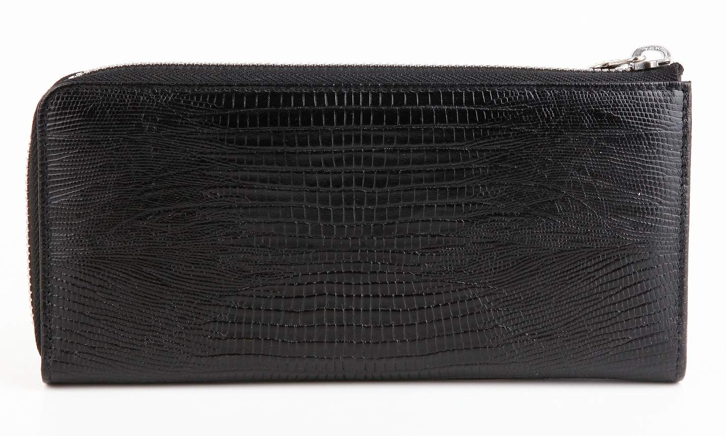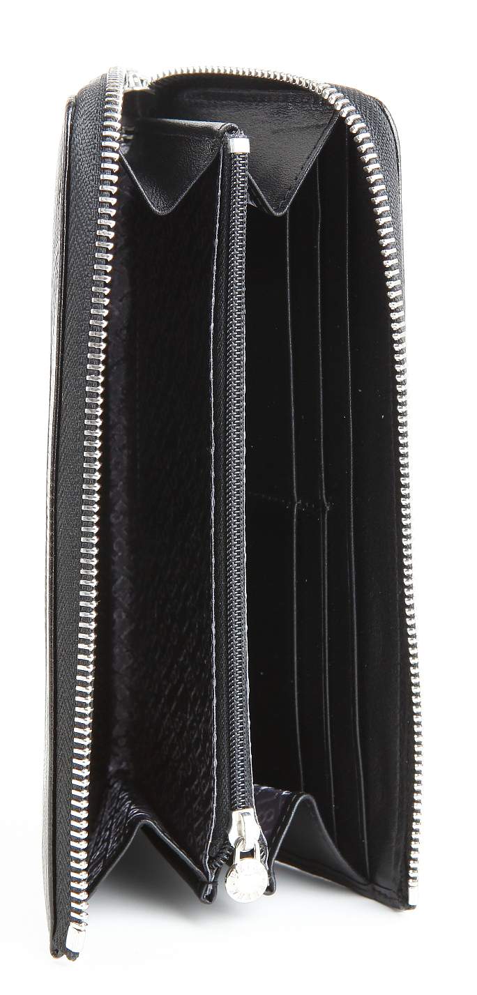Кошелек закрывается на молнию. Внутри модели имеются два вместительных отделения для купюр любой валюты и номинала. Они разделены между собой монетницей на молнии. Два дополнительных, потайных отделения на всю длину портмоне прилегают к внутренним стенкам. Для кредитных и дисконтных карточек предусмотрены 8 прорезных кармашков.