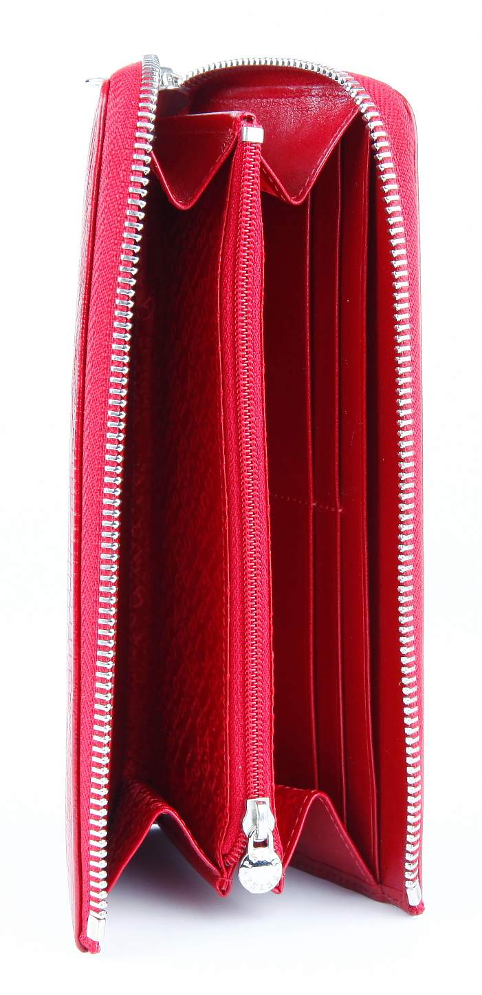 Портмоне закрывается на молнию. Внутри модели имеются два вместительных отделения для купюр любой валюты и номинала. Они разделены между собой монетницей на молнии. Два дополнительных, потайных отделения на всю длину портмоне прилегают к внутренним стенкам. Для кредитных и дисконтных карточек предусмотрены 8 прорезных кармашков.