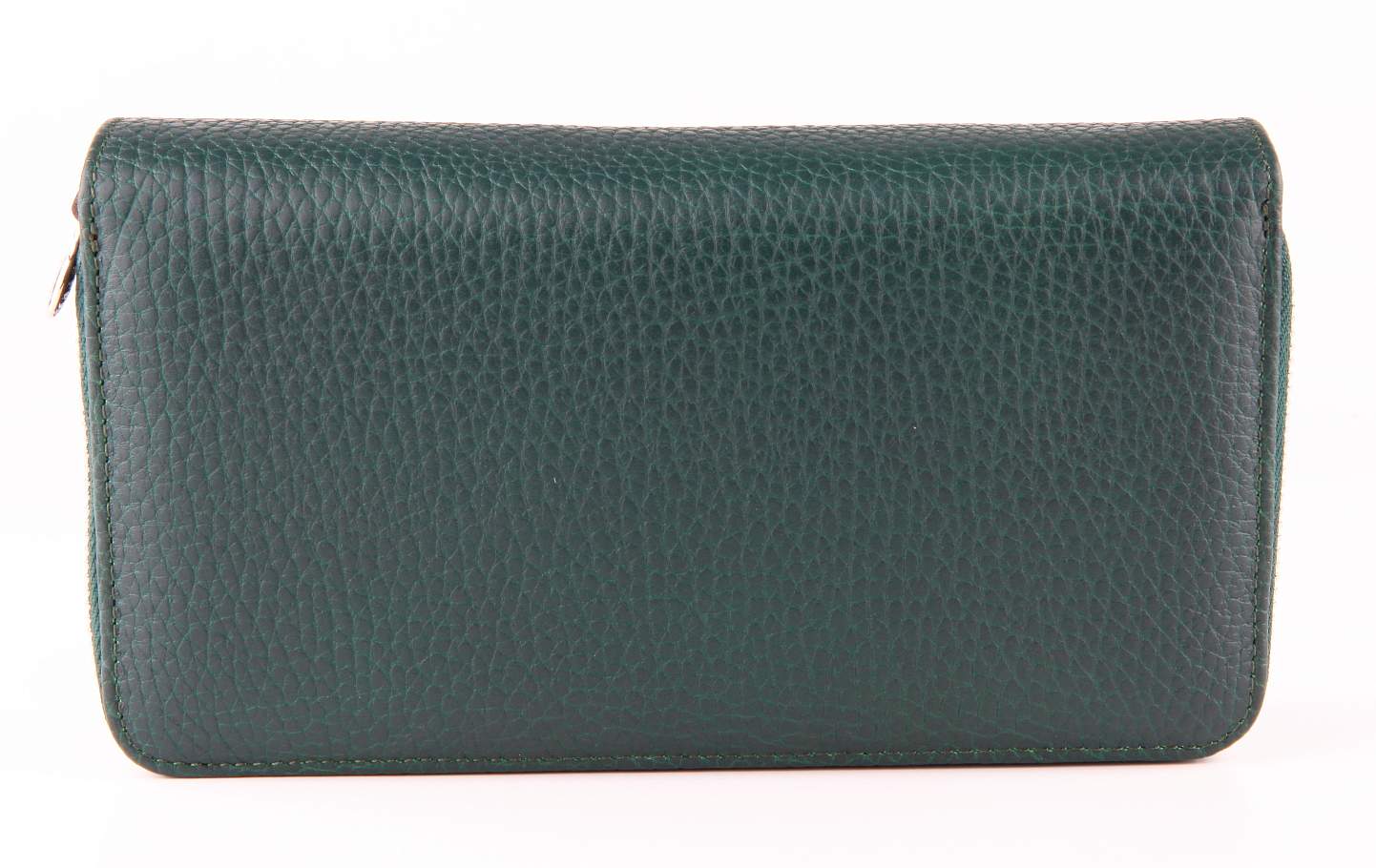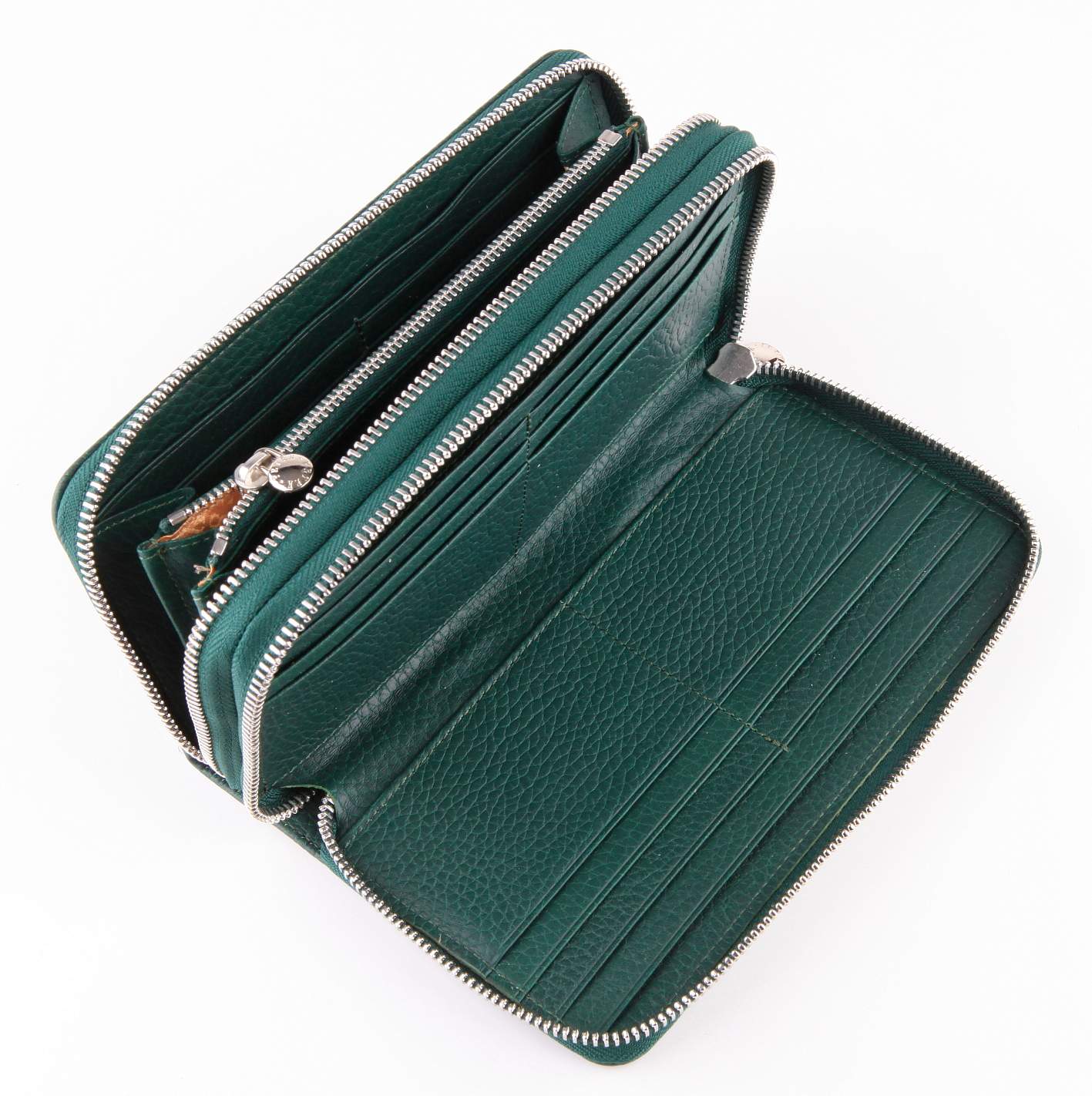Удобная, вместительная модель в зеленом цвете. Включает в себя два больших отделения на молнии. Одно отделение имеет четырнадцать карманов для визитных или дисконтных карт и два больших. Во втором - два отделения для купюр, три дополнительных кармана, один из которых закрывается на молнию и шесть для визитных карт.